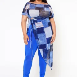 Plus Size Patchwork Mesh Print Asymmetric Top