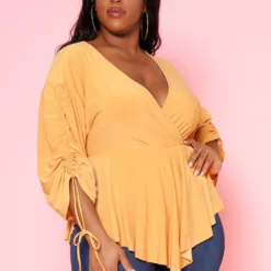 Plus Size Surplice Shirred Sleeve Peplum Blouse