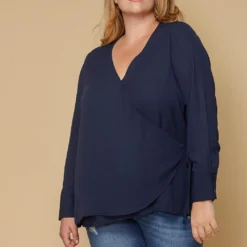 Pleione Wrap Front Long Sleeve Plus Size Women Clothing Blouse