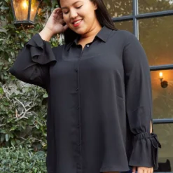 Pleione Self-tie Bell Cuff Plus Size Women Clothing Button Down Shirt Blouse