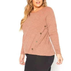 Asoph Plus Size Ribbed Knit Button Hem Long Sleeve Top