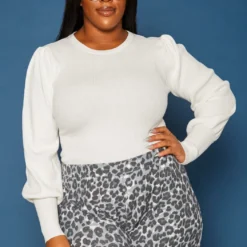 Asoph Plus Size Ribbed Knit Puffy Long Sleeve Top
