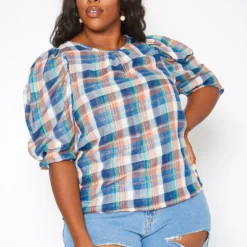 Asoph Plus Size Tartan Plaid Print Puff Sleeve Top