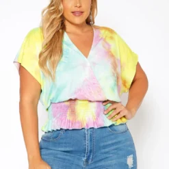 Asoph Plus Size Tie Dye Cross Lace Open Back Design Shirt