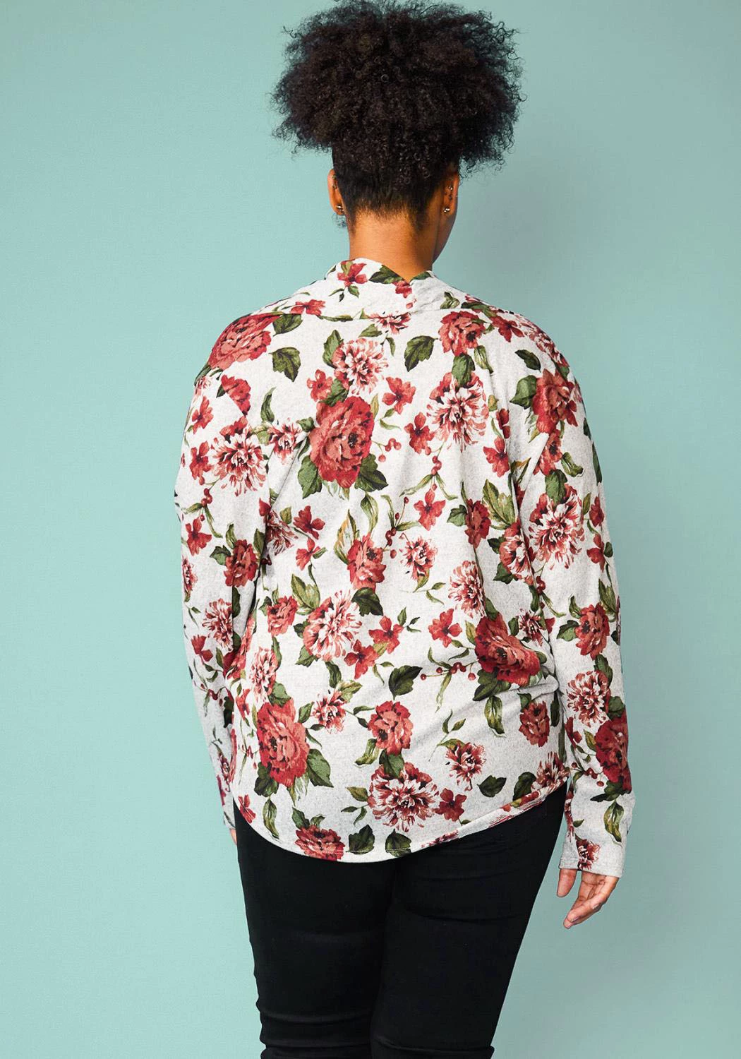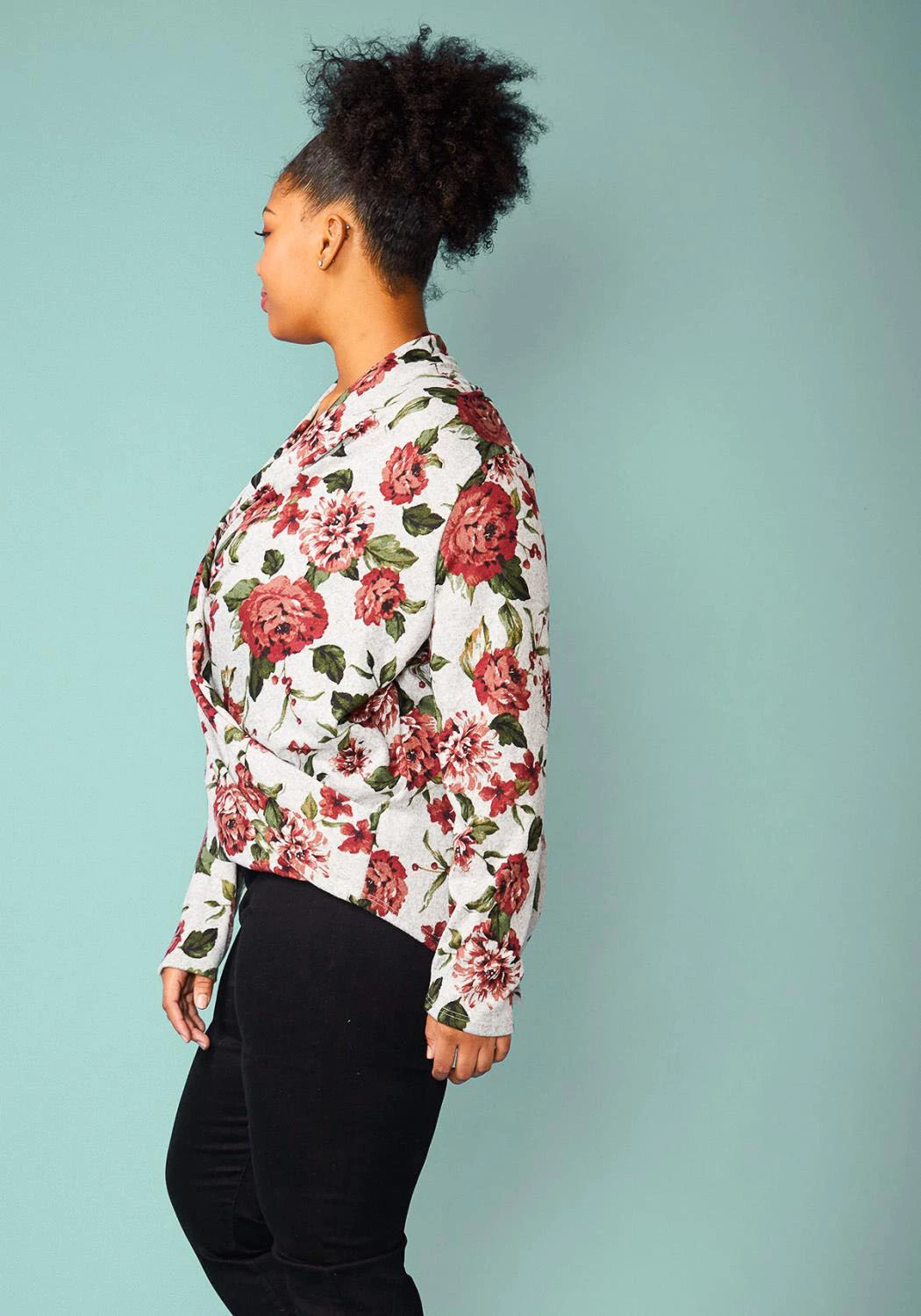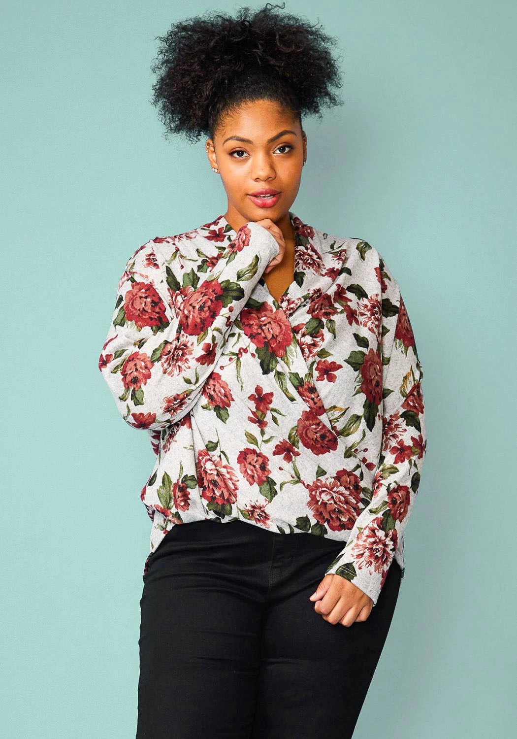 Plus size floral wrapped front long sleeve cozy sweater blouse.