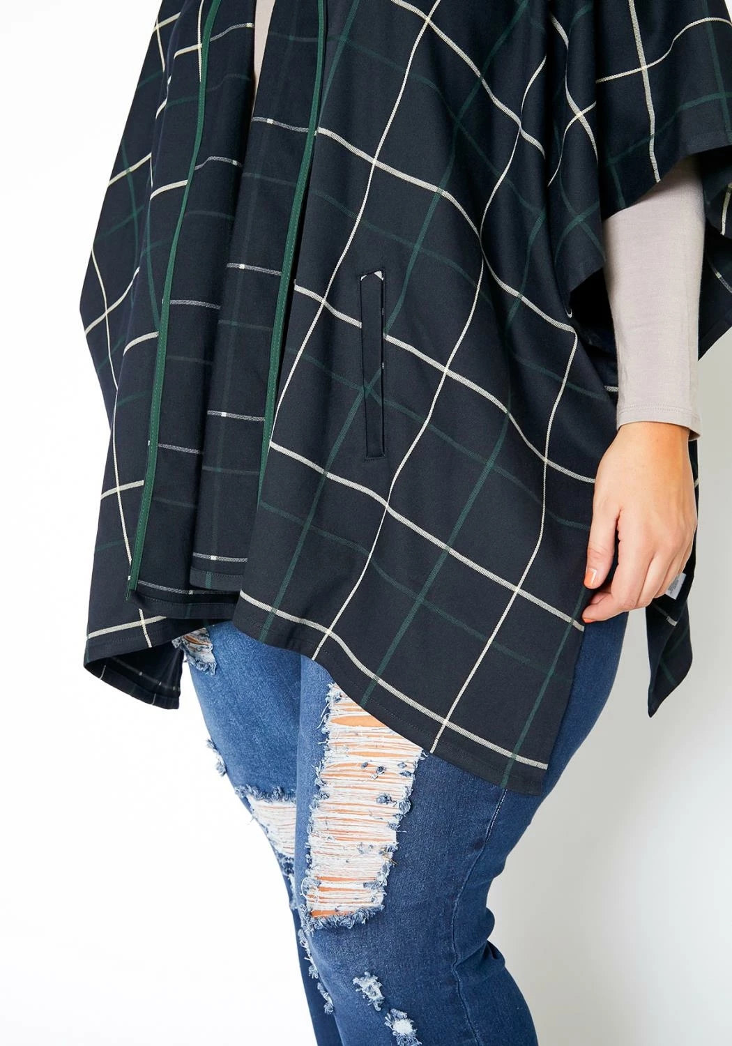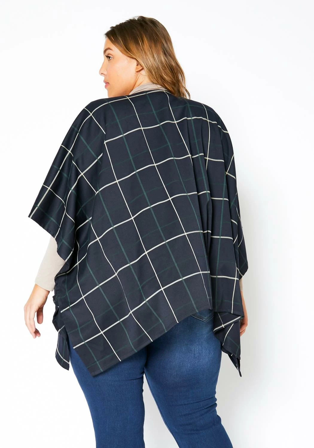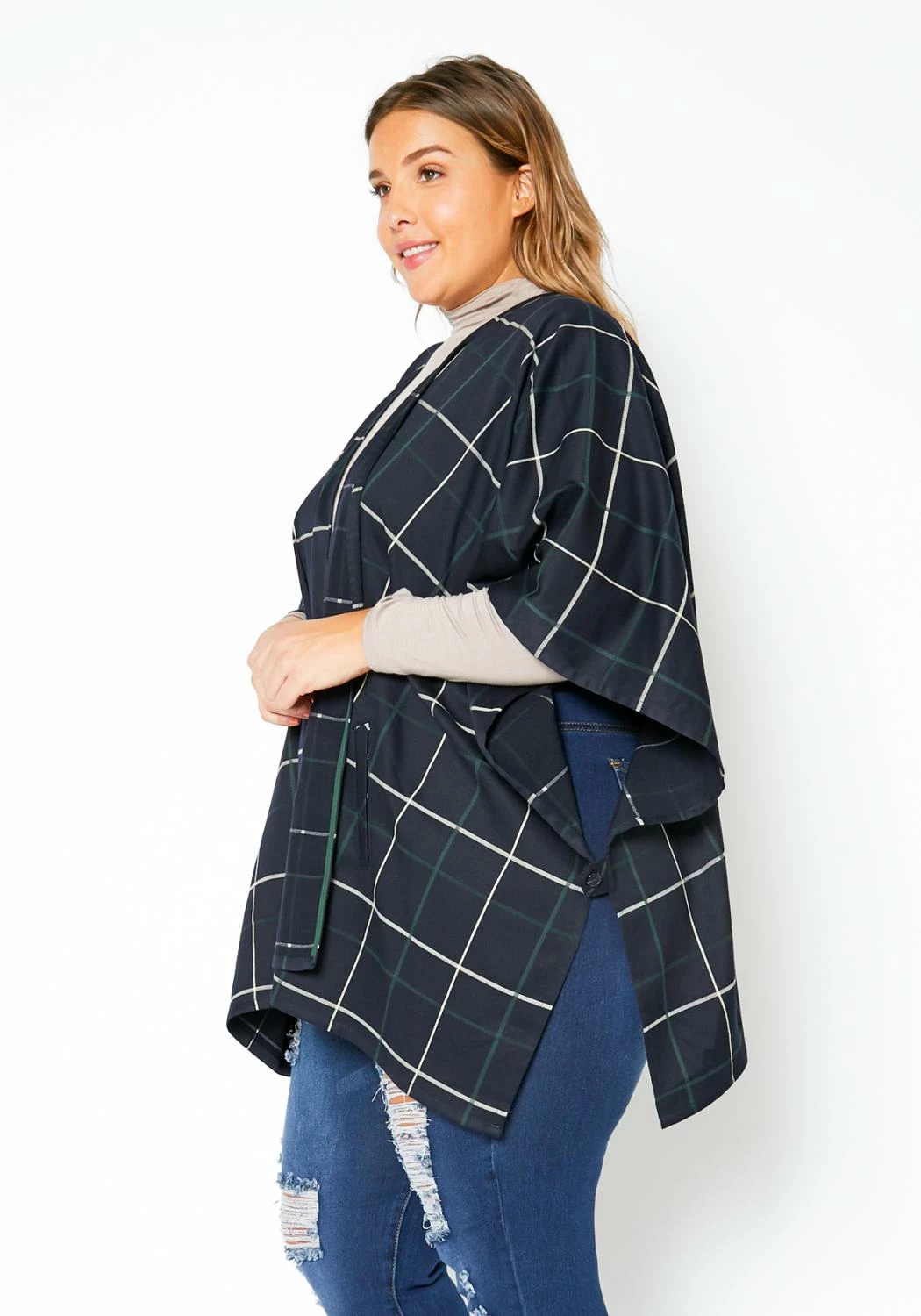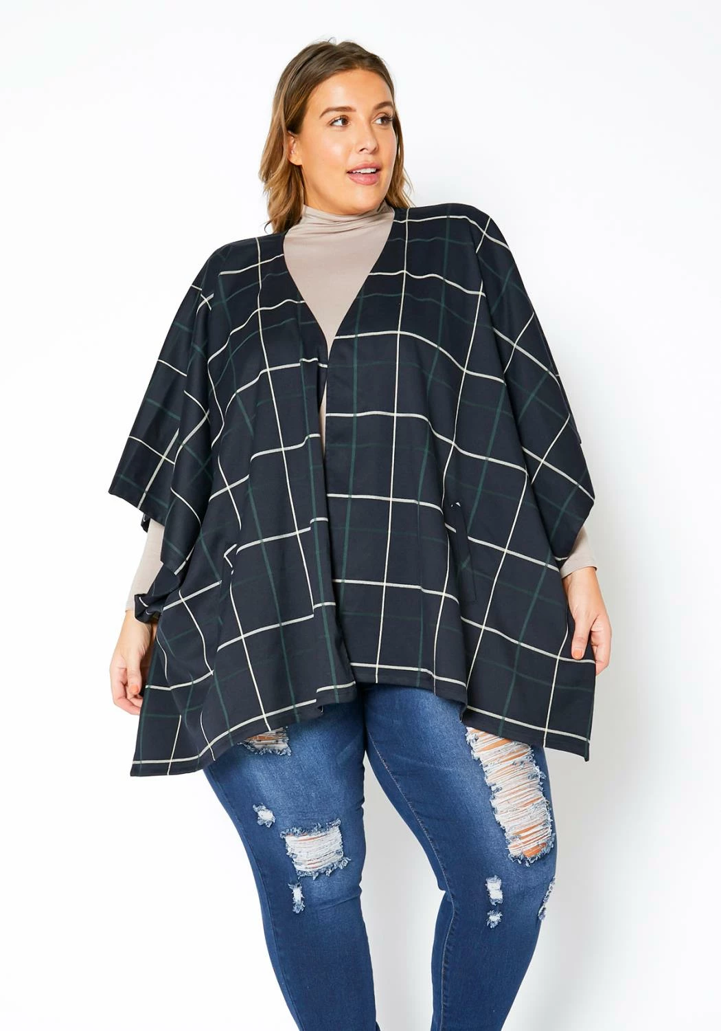Women’s plus size open front plaid print poncho style oversized cardigan with pockets.