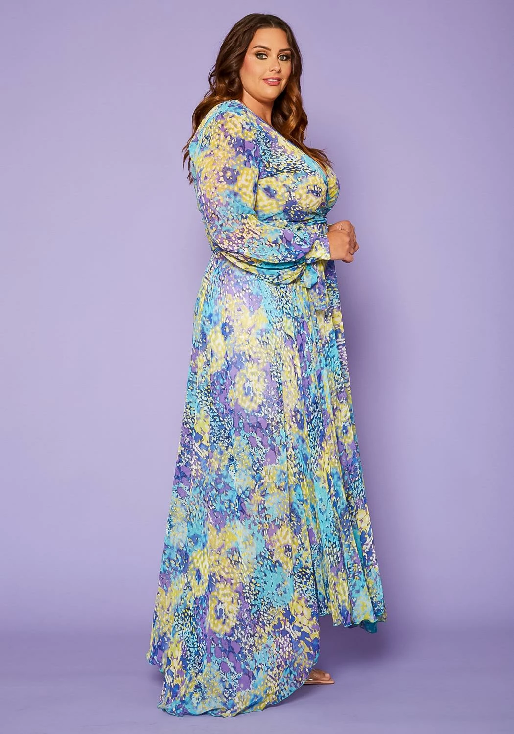 Plus size women’s dress in fit & flare style, featuring a front v-neck, long sleeve cuff hem with button details and waist tie ascent.