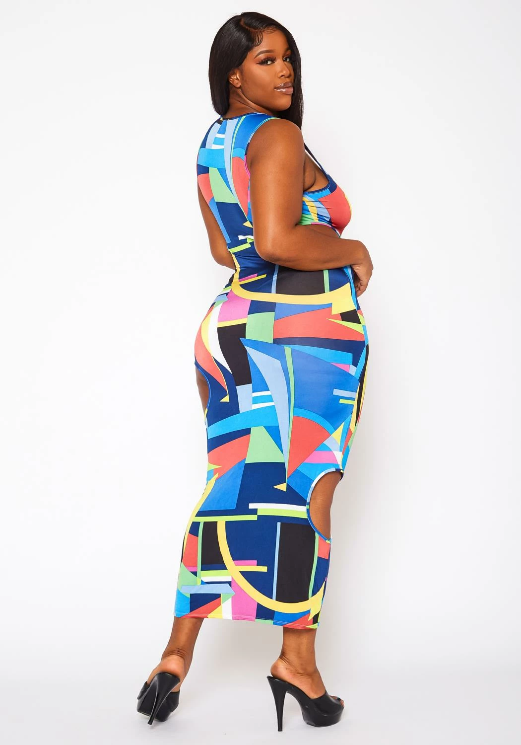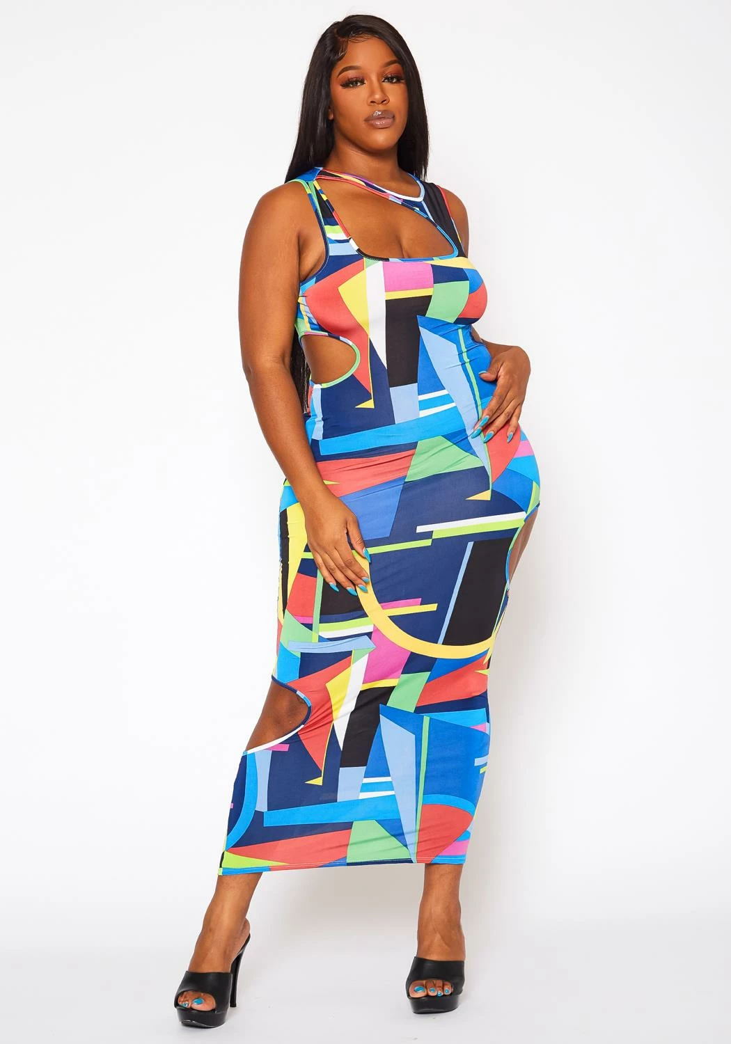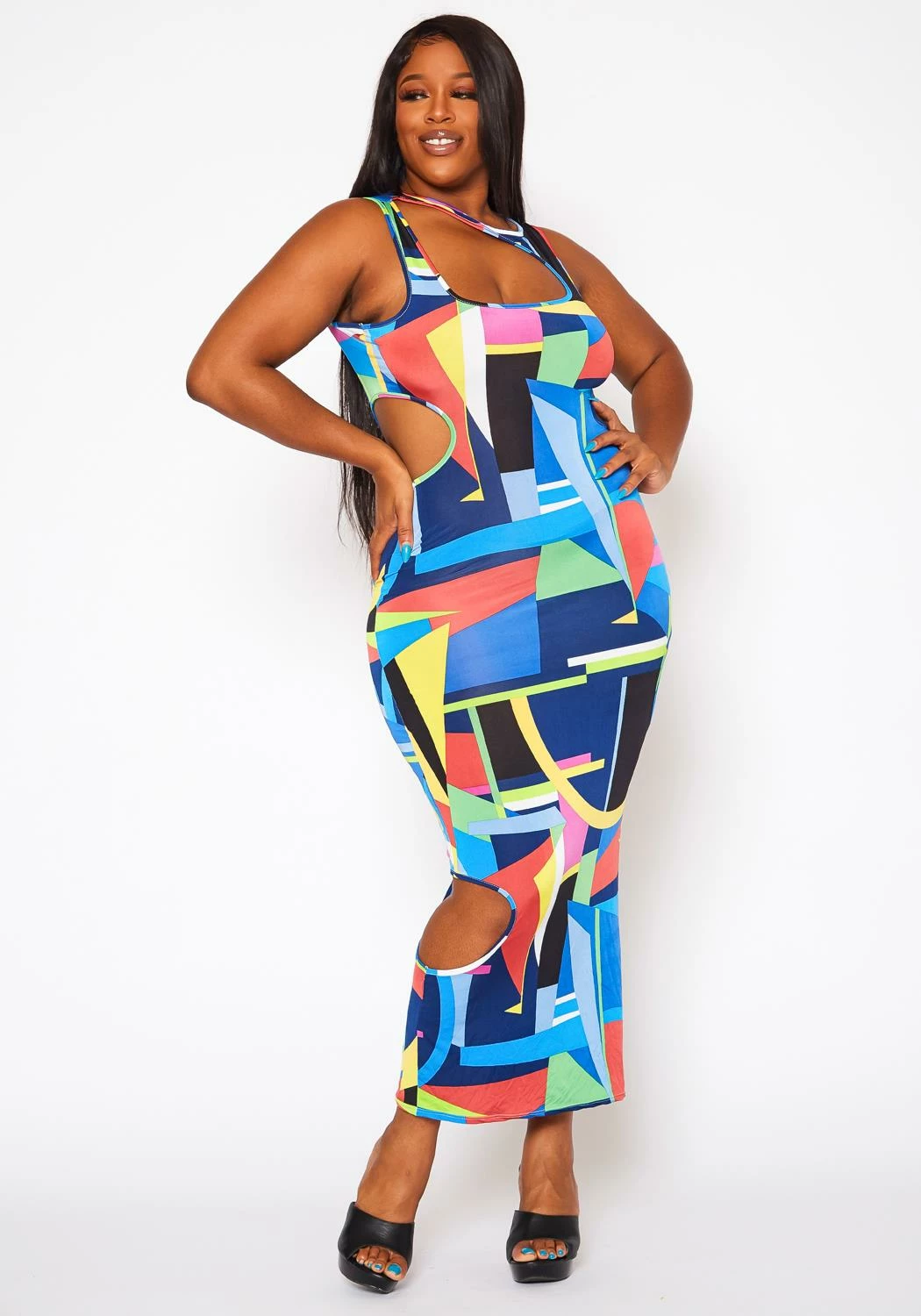 Plus size women’s dress in maxi style, featuring abstract patterm, cut out detail, sleeveless & round neck hem.