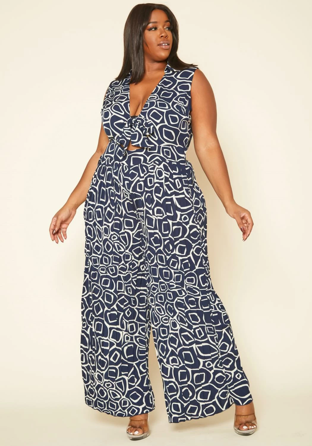 Effortless plus size women’s jumpsuit in unique abstract print, v-neck style, tie front detail, sleeveless design and wide flare leg hem.