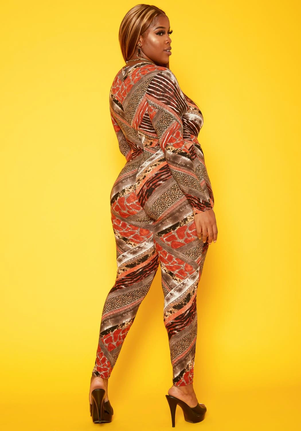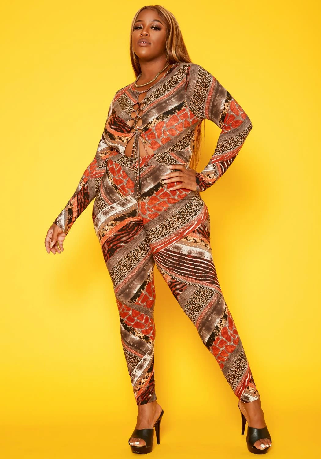 Show your wild side in this stunning jumpsuit in multi animal print, bodycon fitting, long sleeves, cross-lace front and round neck style.