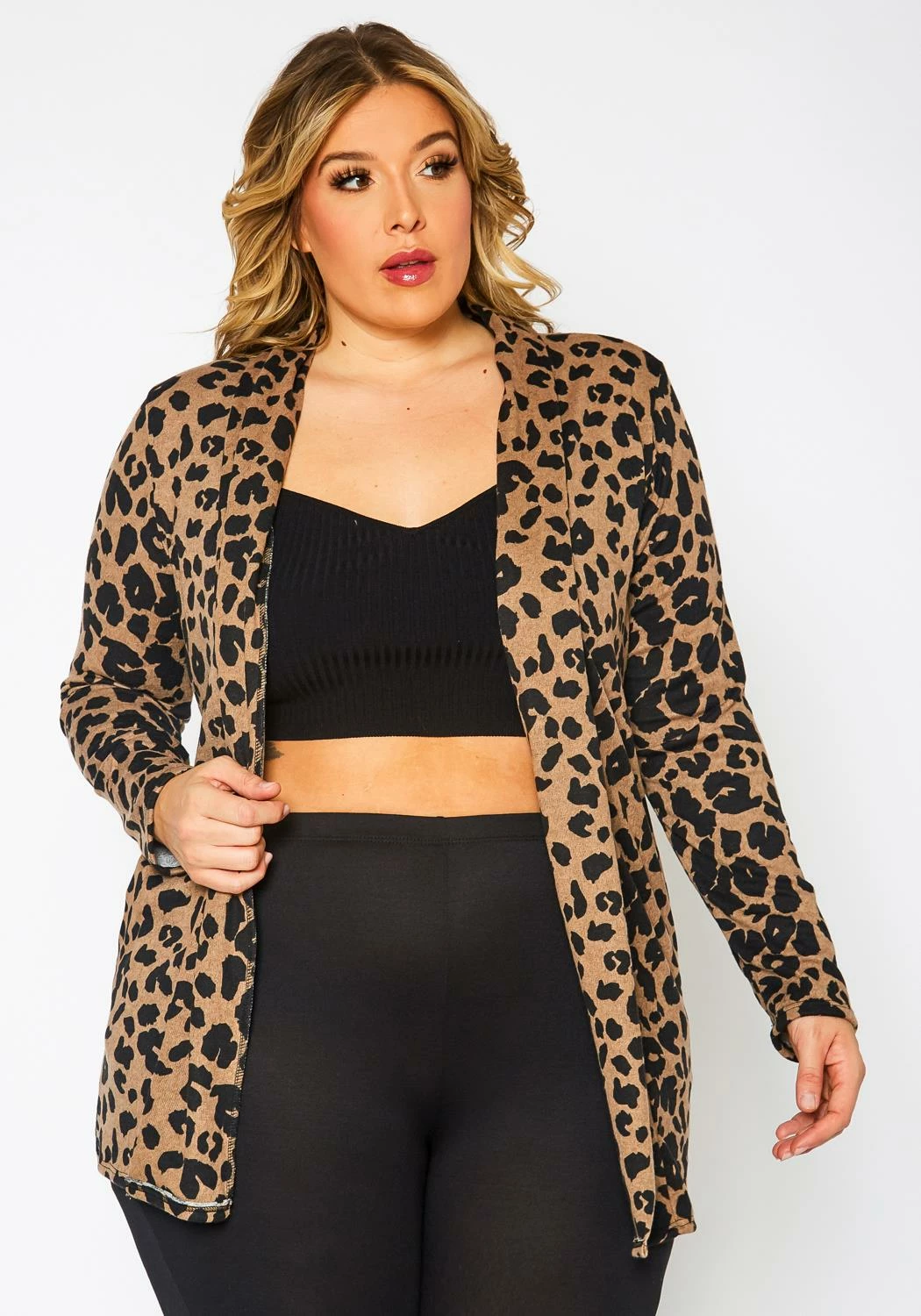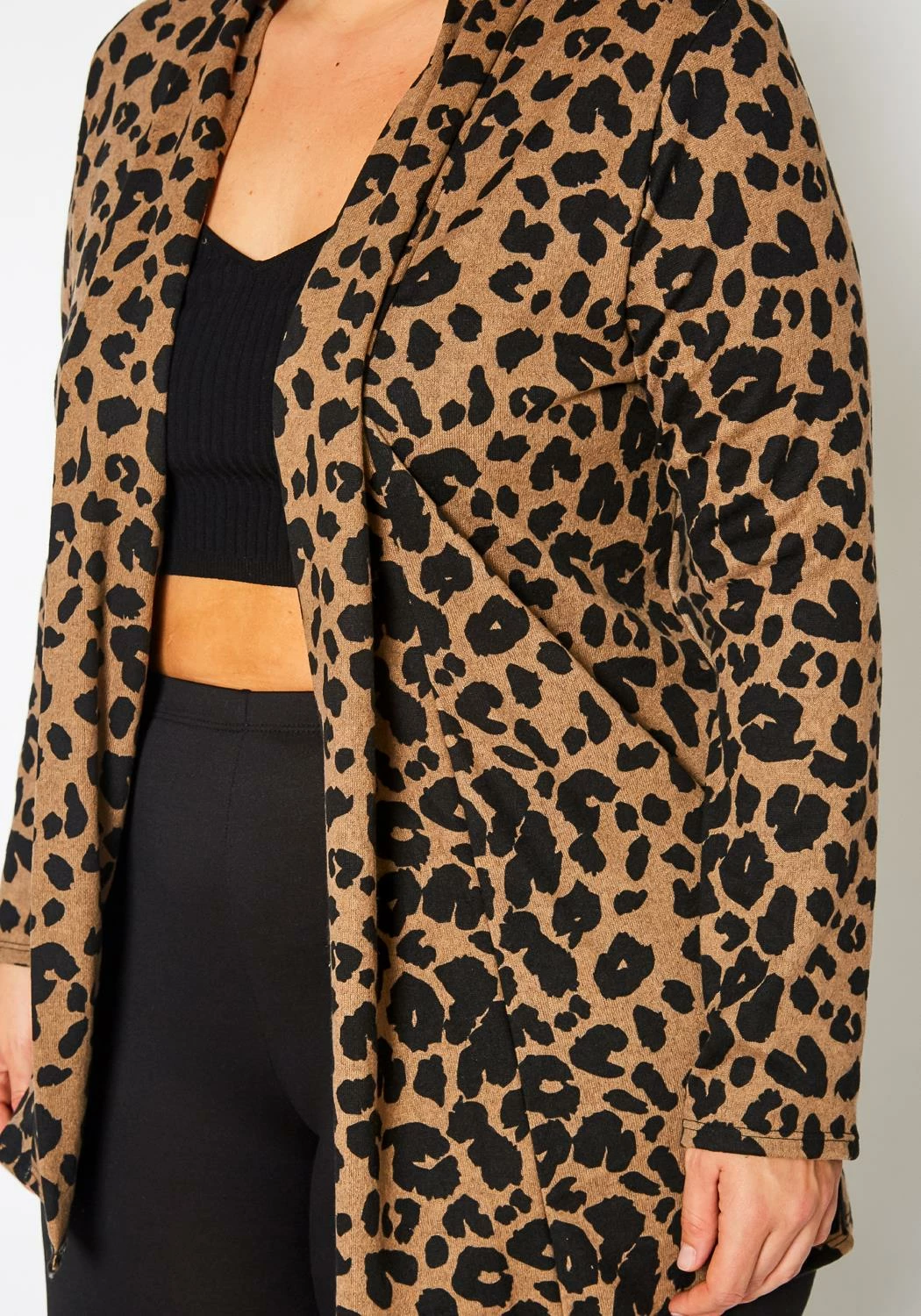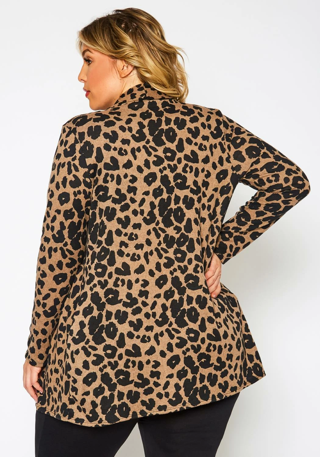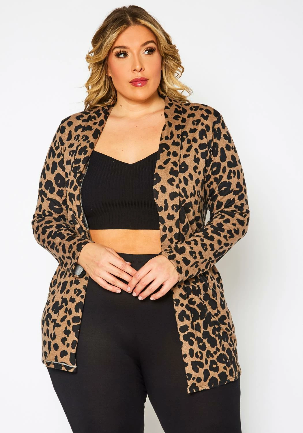 Casual plus size women’s soft knit cardigan in animal pattern, fitted long sleeves and open front style.