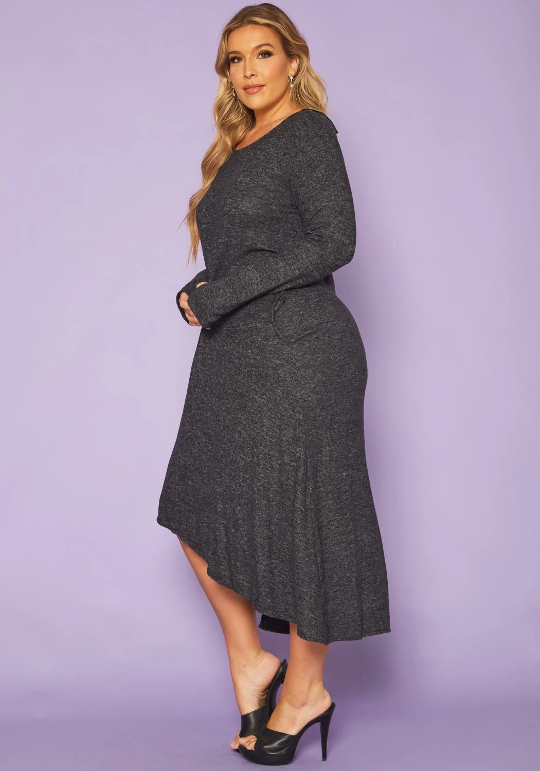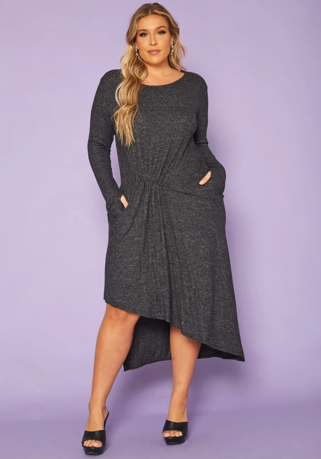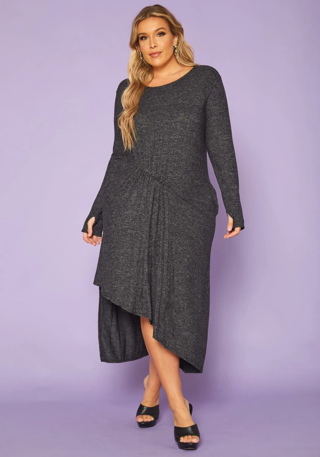 Plus size women’s midi dress features fitted long sleeves with thumb keyhole, ruched front detail, crew neck style and a front asymmetric cut.