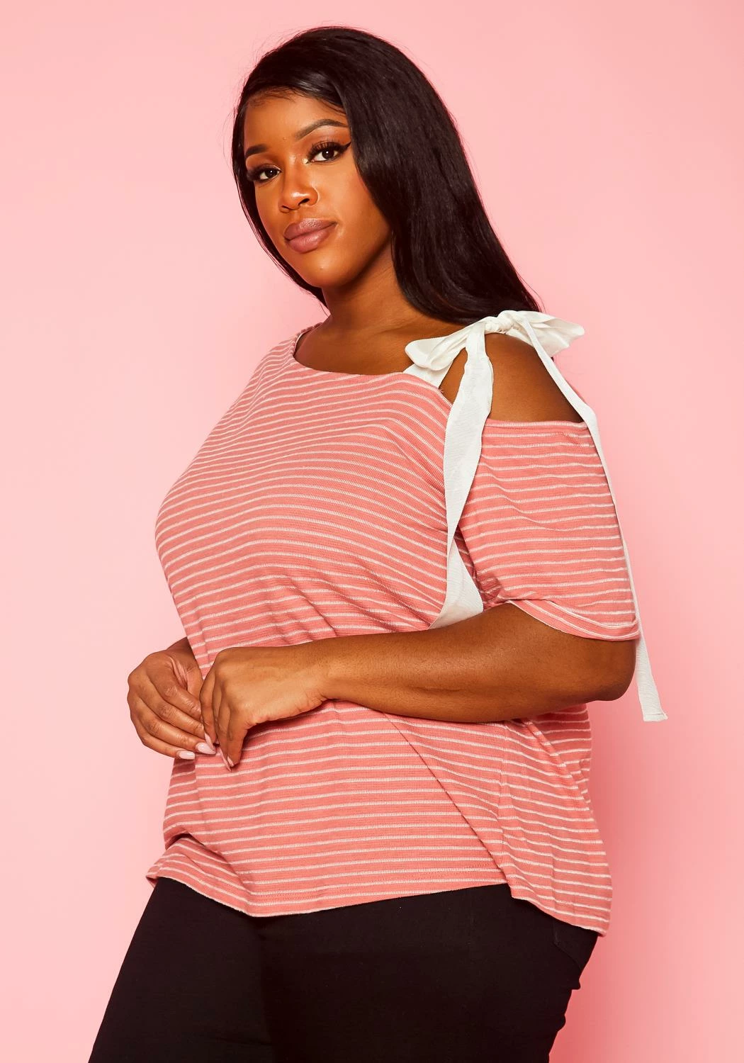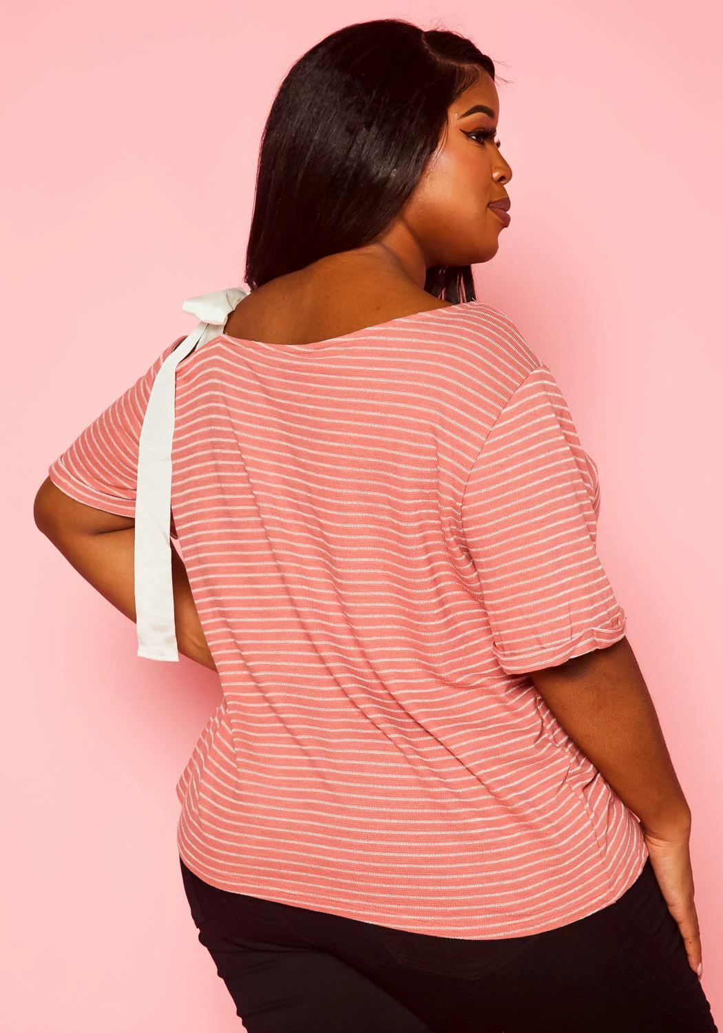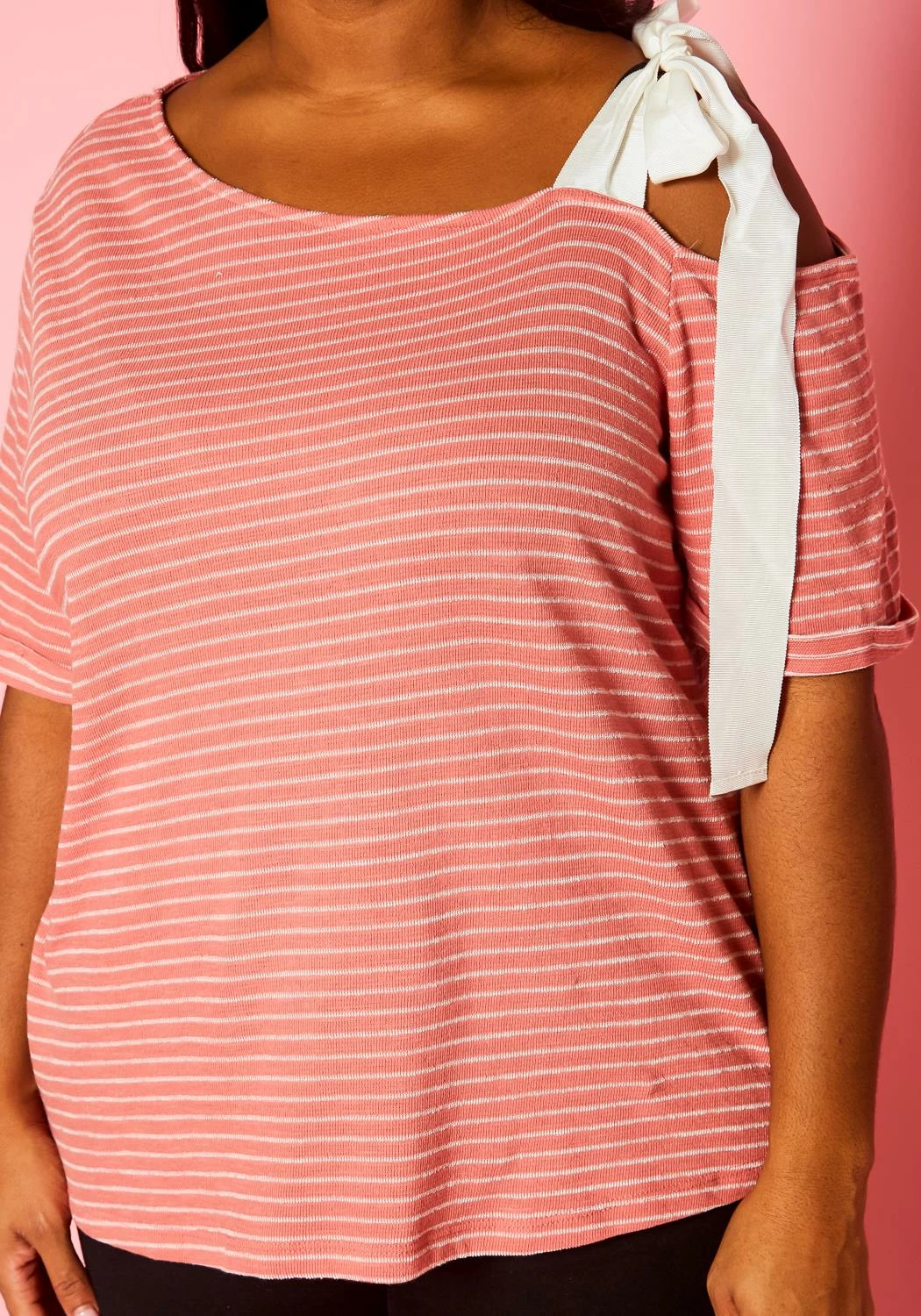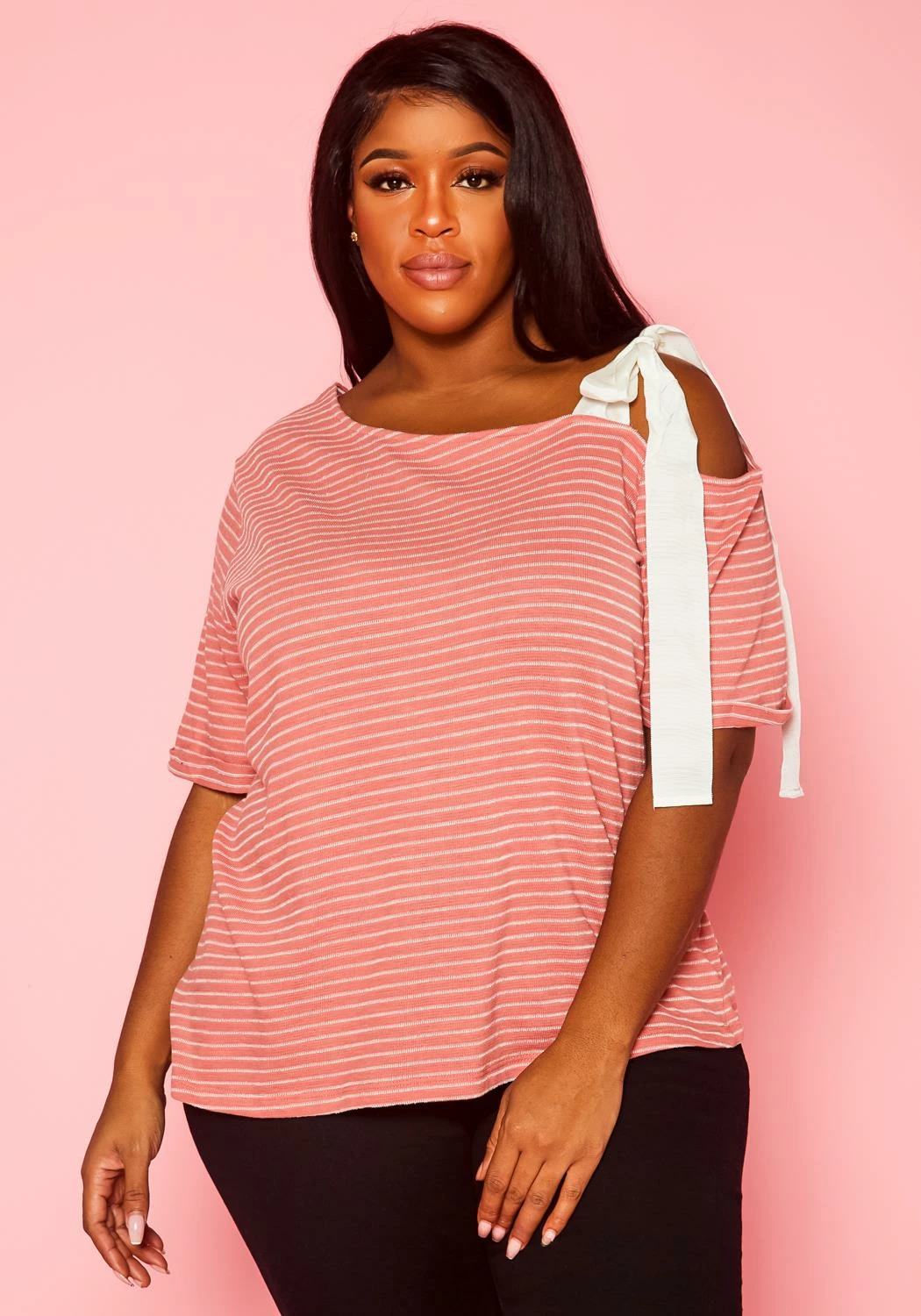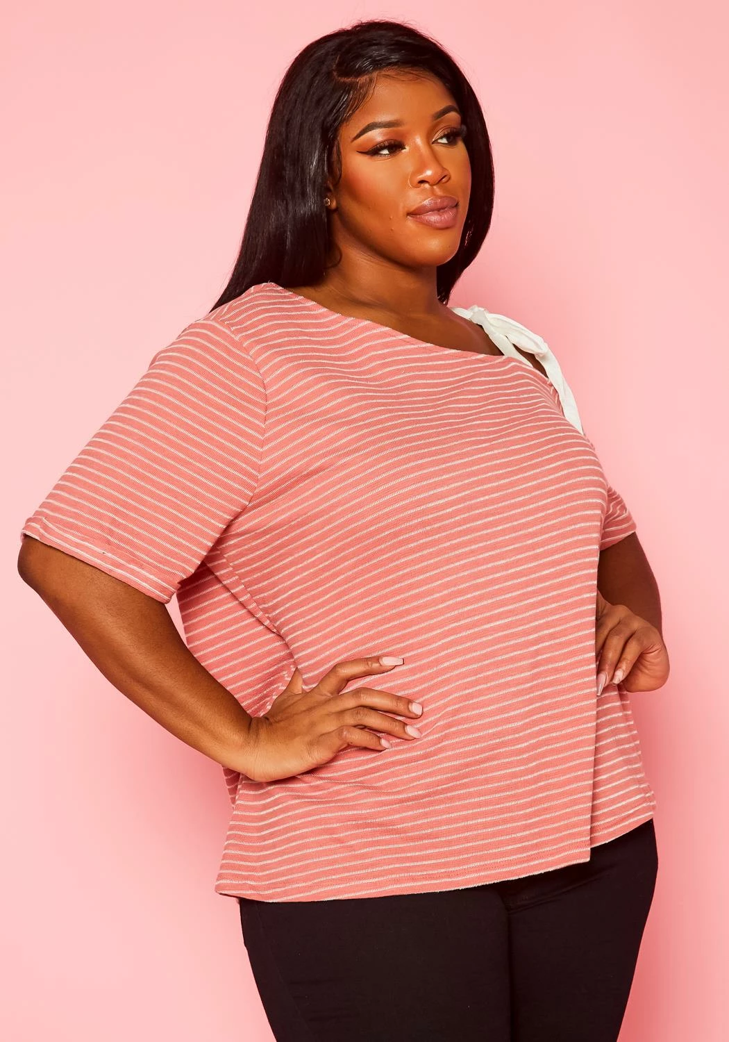 One of a kind plus size women’s striped pattern shirt with asymmetric neckline, short sleeves and single shoulder tie detail.