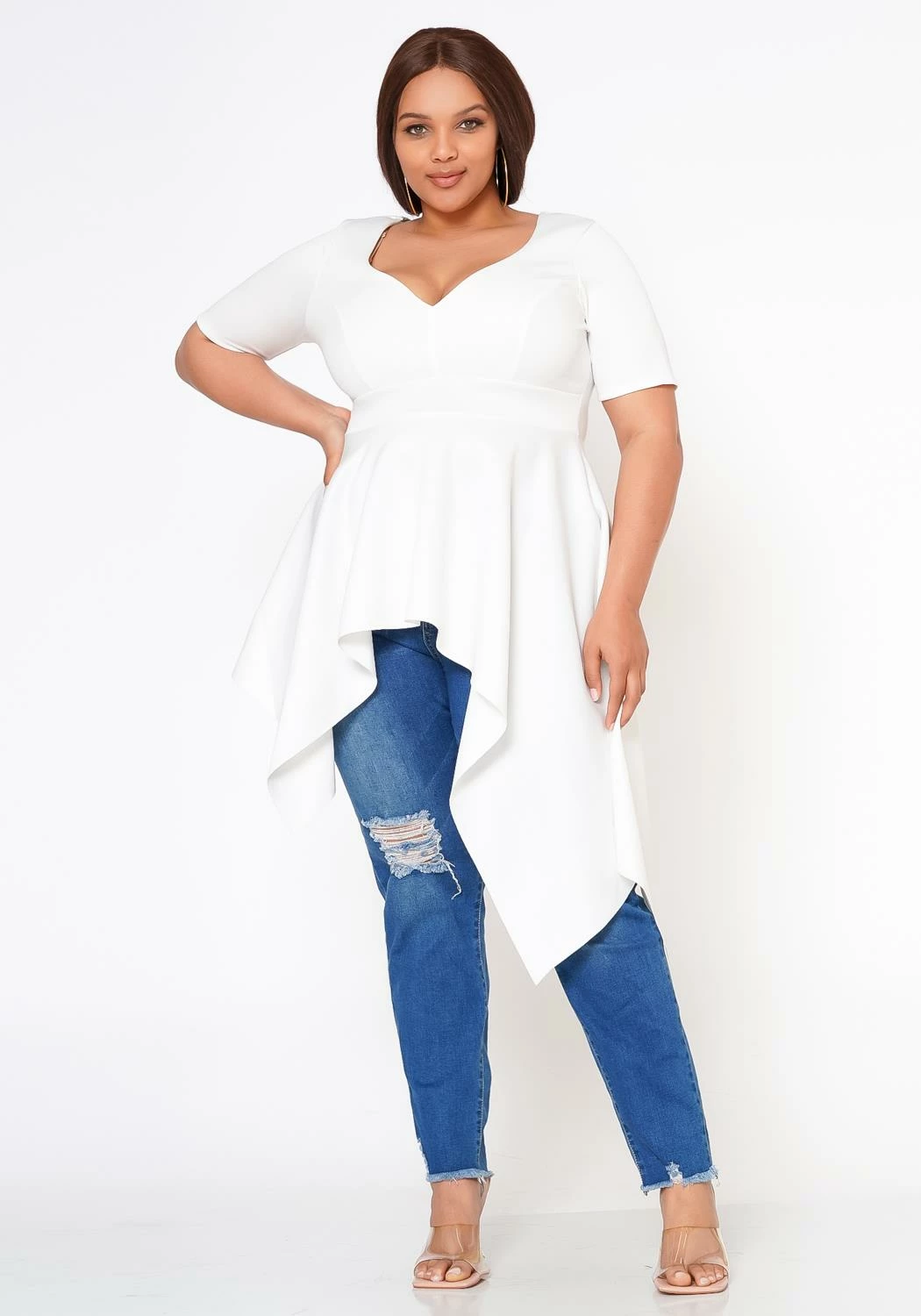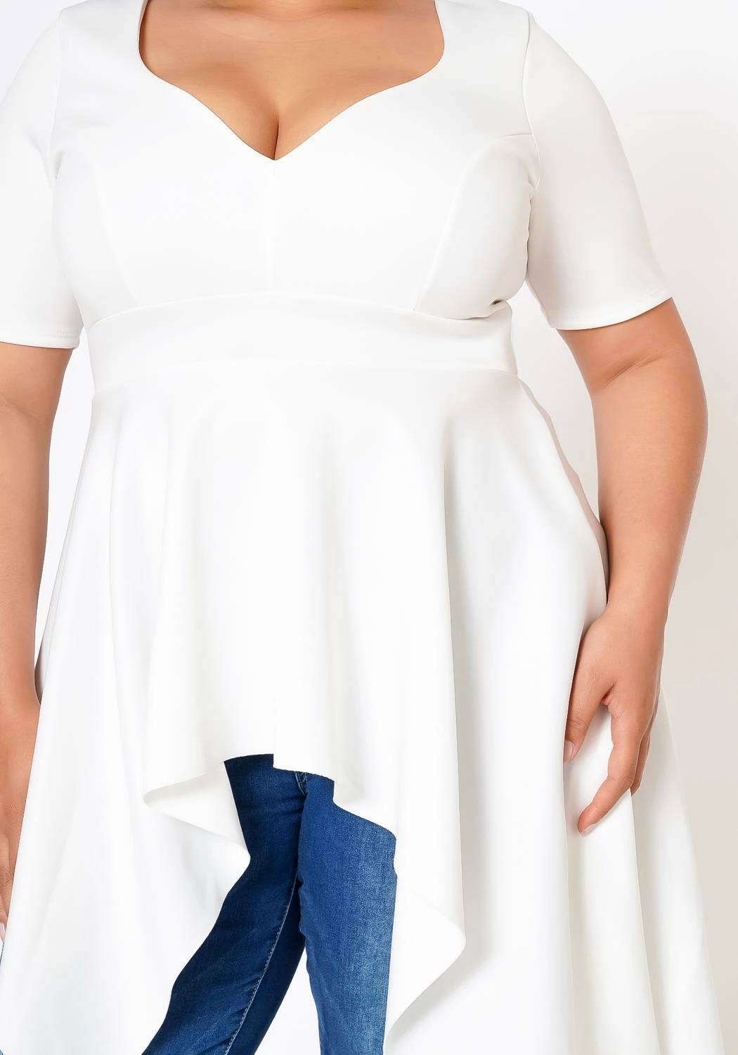 Effortless plus size women’s blouse in sweetheart v-neck style, short sleeves and asymmetric flare end.