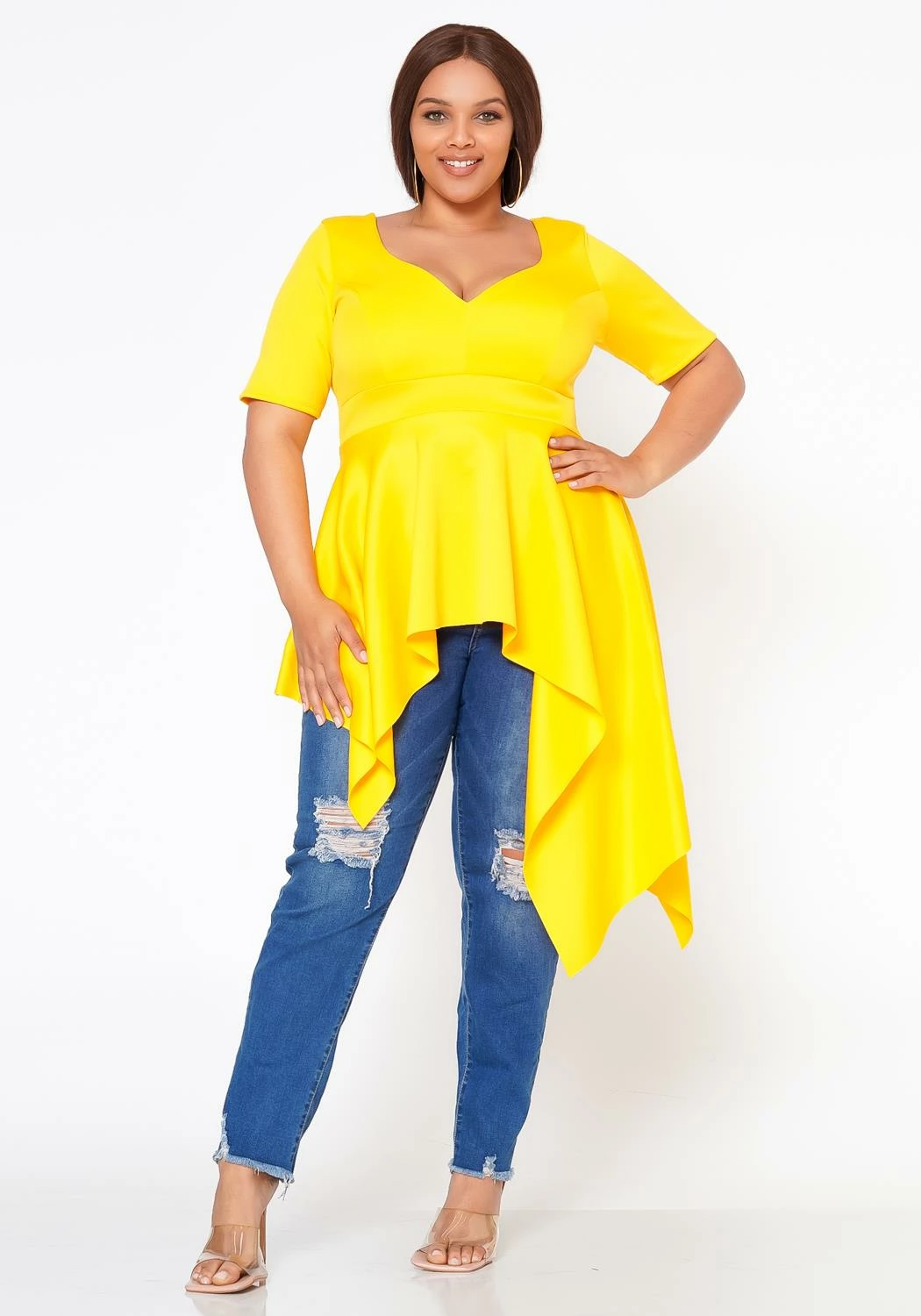 Effortless plus size women’s blouse in sweetheart v-neck style, short sleeves and asymmetric flare end.