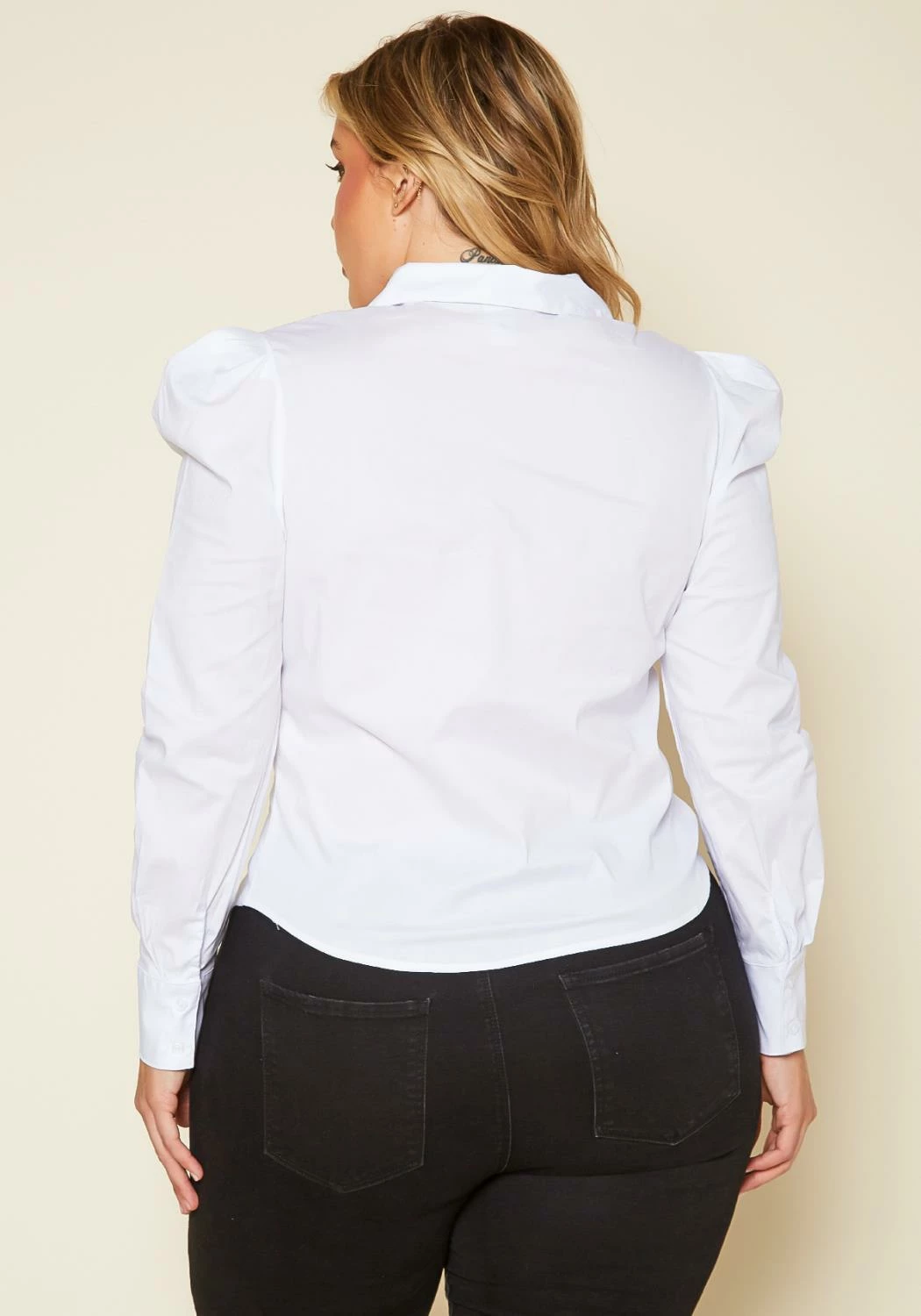 Plus size women’s top in collar neck style, featuring ballon shoulder detail with long sleeves and cuff hem and front button closure.