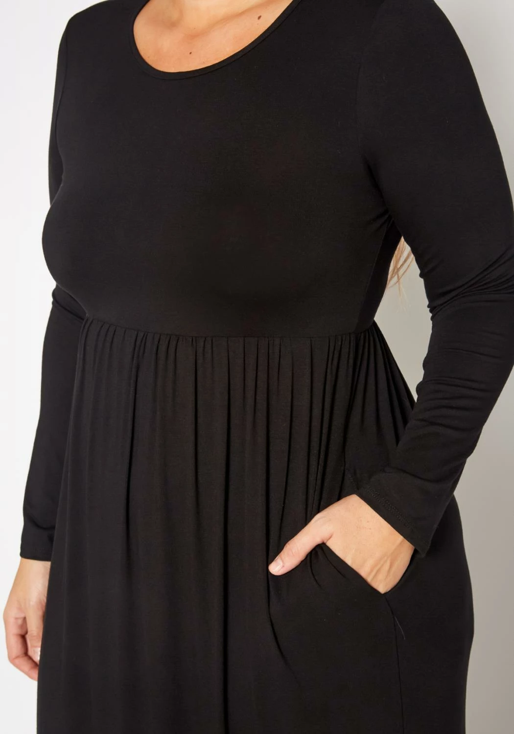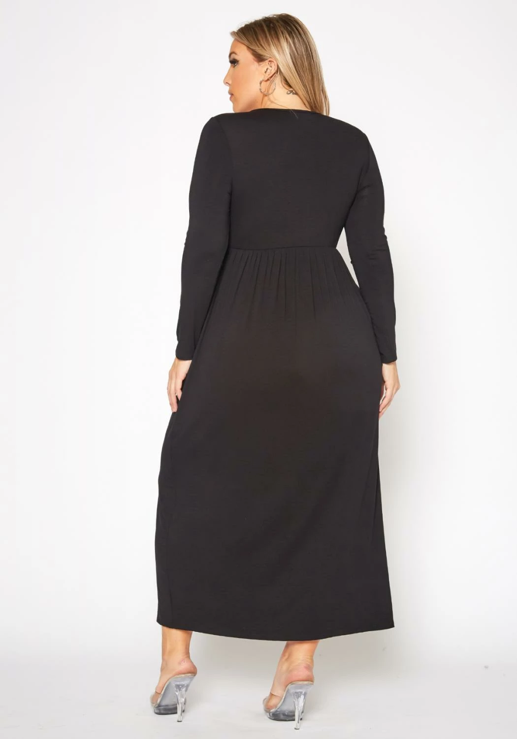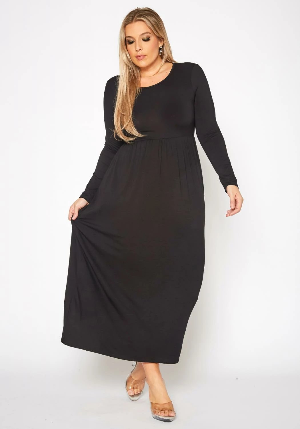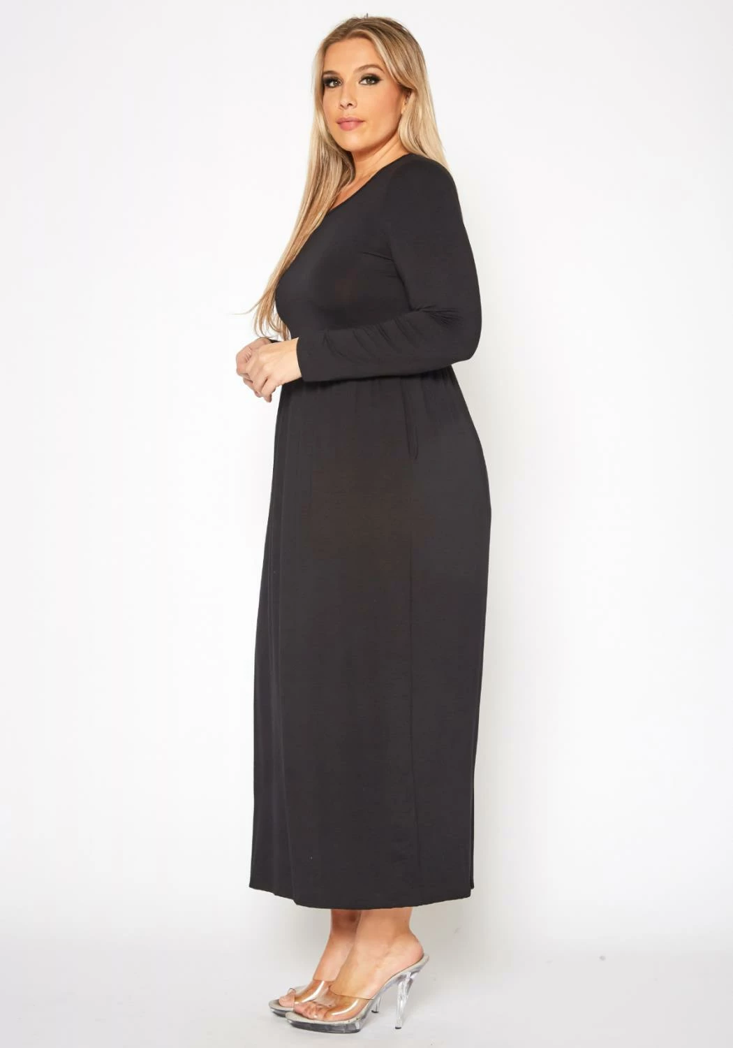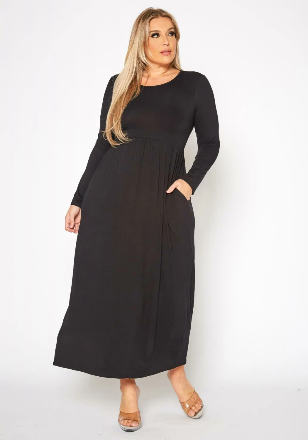 Plus size women’s casual maxi dress in fit to flare design, solid color, fitted long sleeves and round neck style.