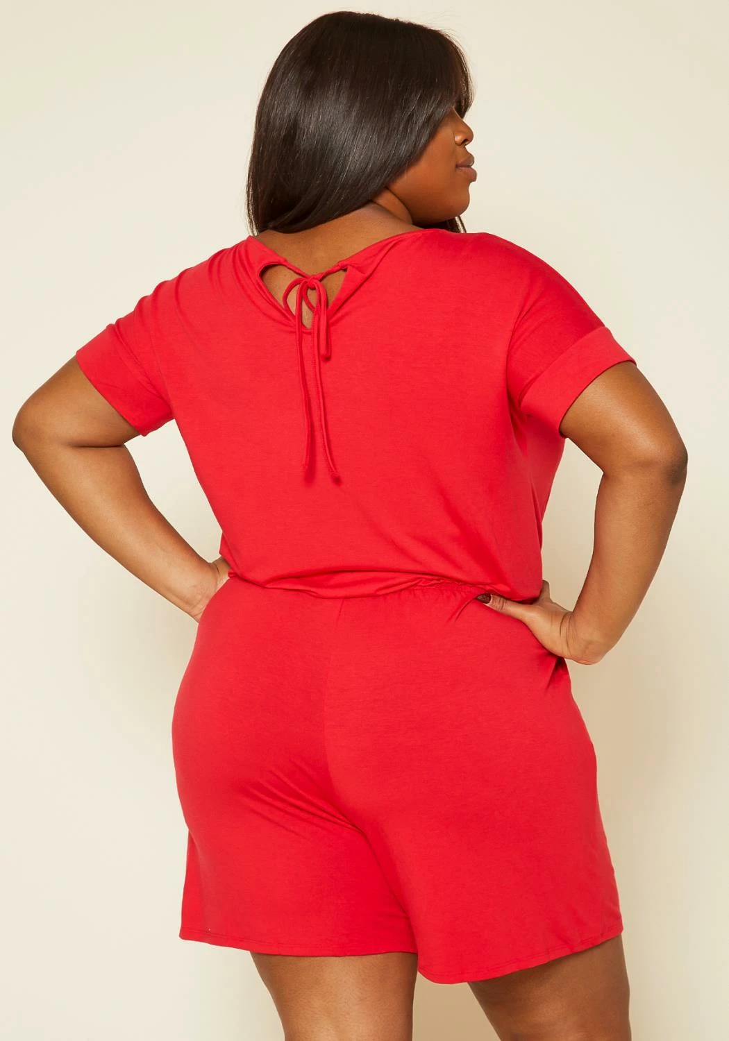 Casual plus size women’s lounge romper in solid color, short sleeves, round neck style and elastic waistline.