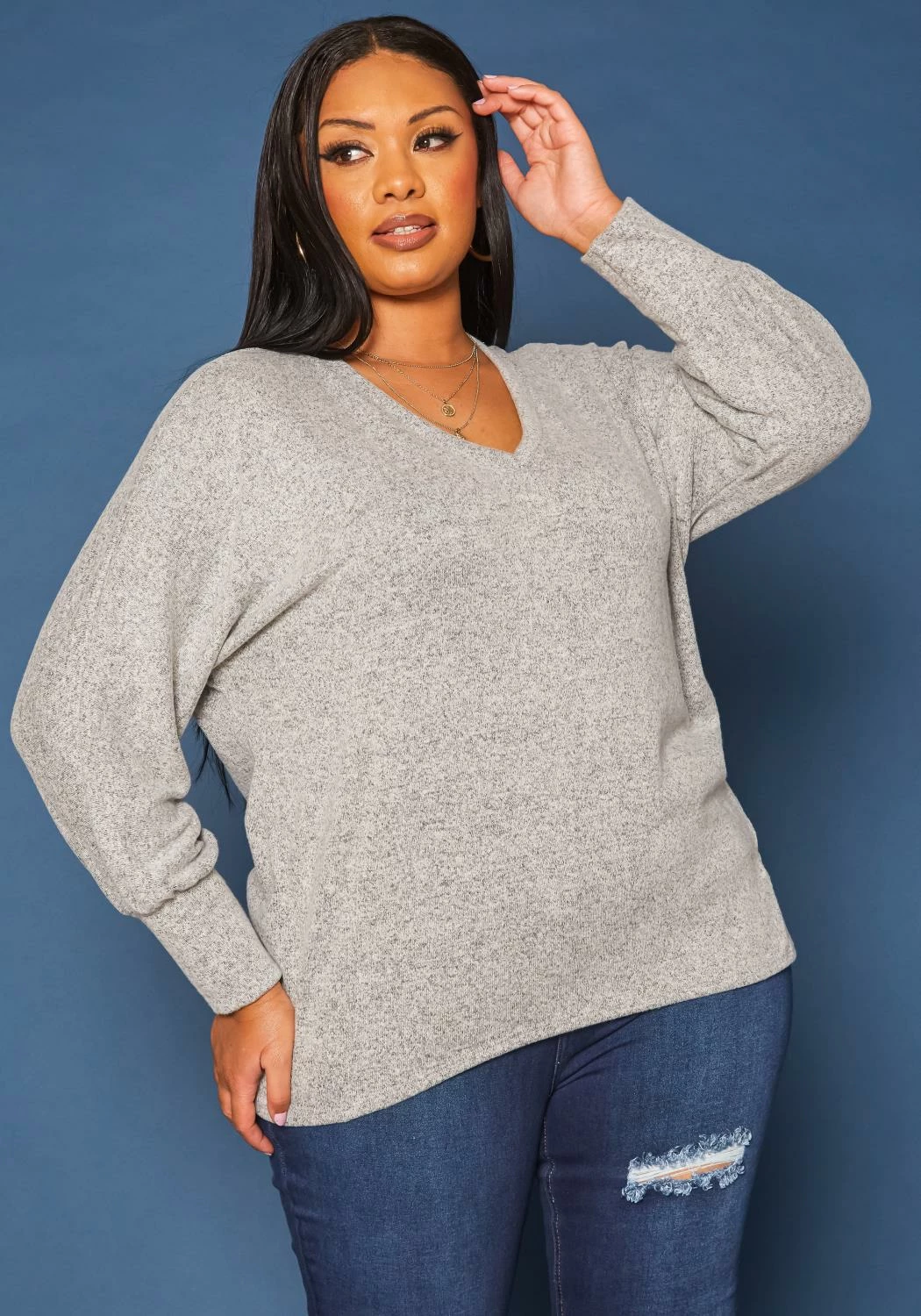 Casual plus size women’s knit sweater in v-neck style and drop shoulder long sleeves with fitted wrist cuffs.