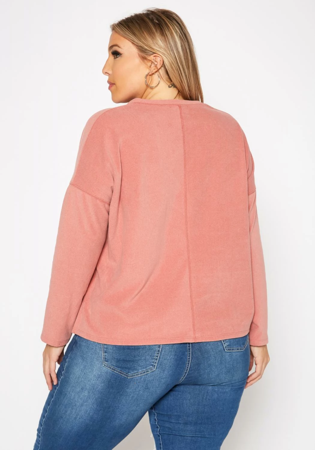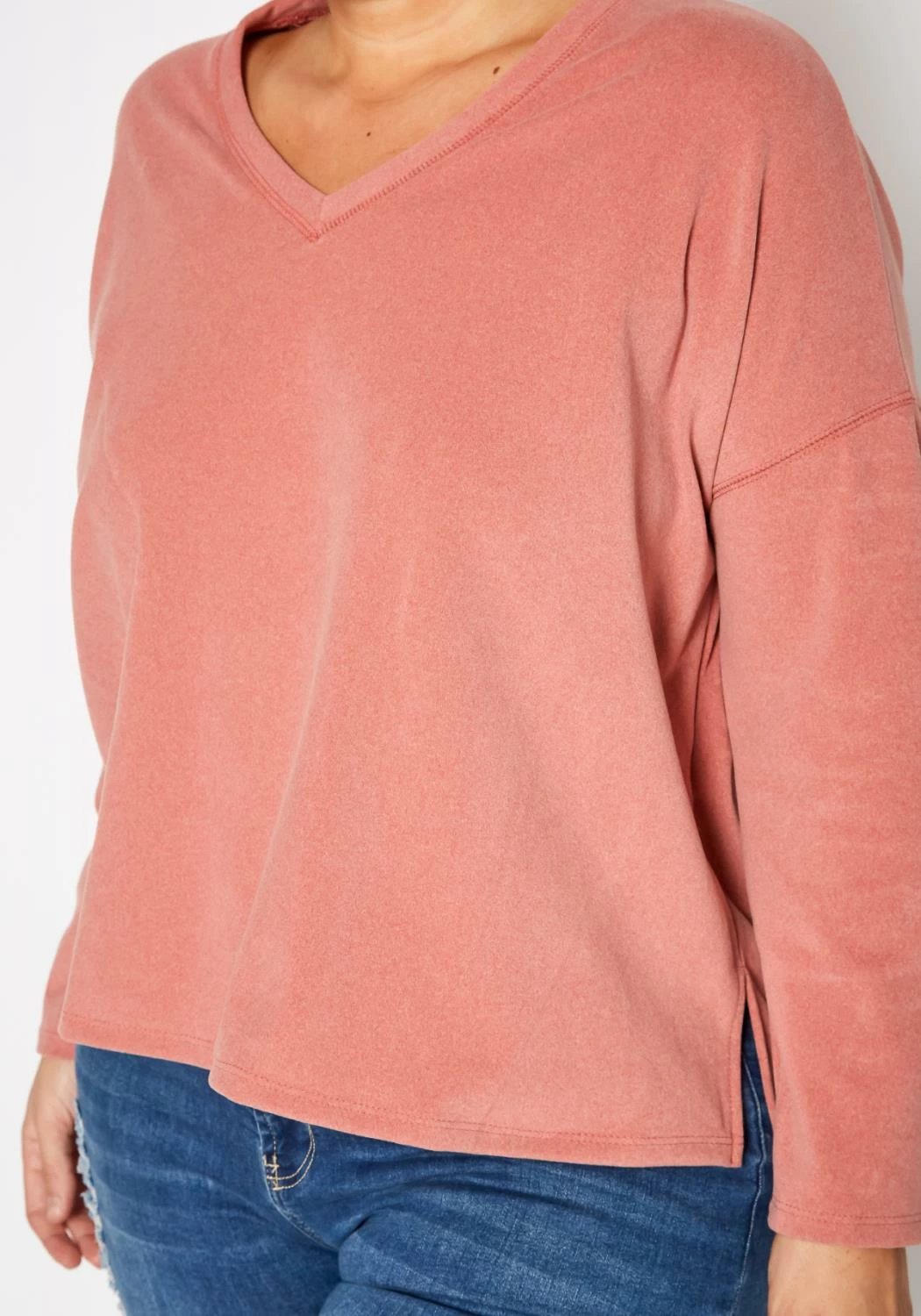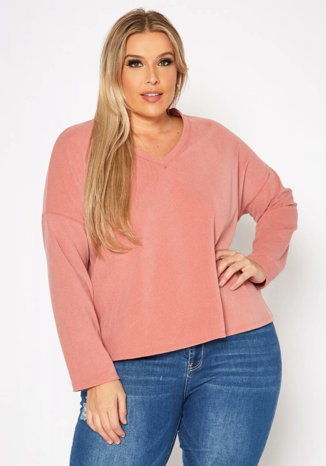 Casual plus size women’s solid color top in v-neck style, long sleeves and soft material.