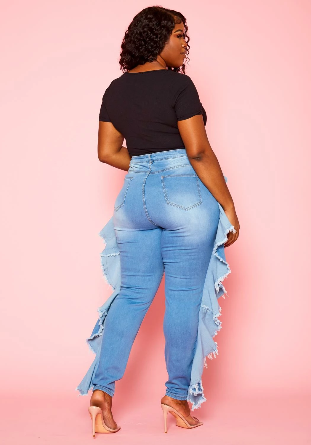 Statement denim jeans in blue wash, ruffle hem details, distresses and pocket hem.
