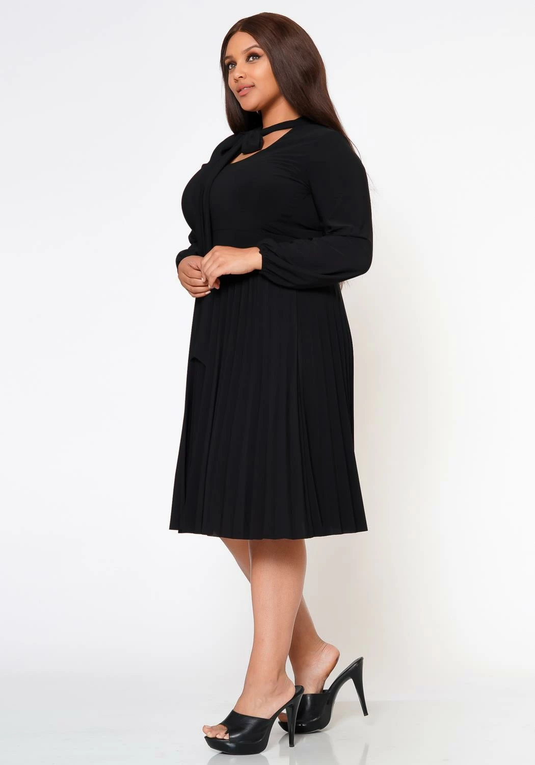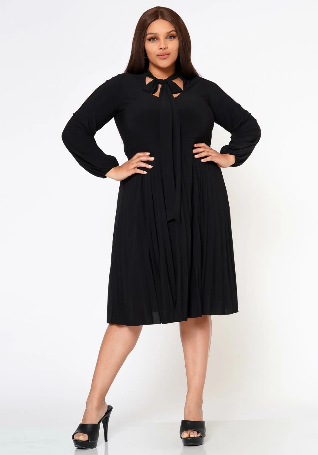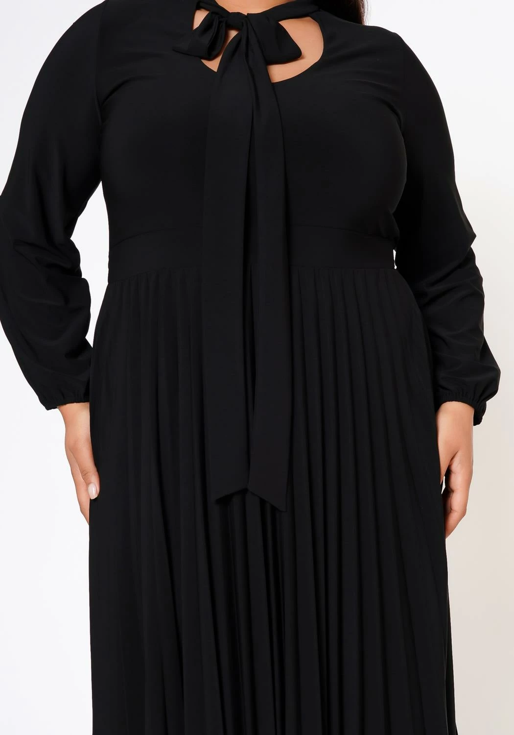 Classy plus size women’s fit & flare dress with pleated design, long sleeves, fitted wrist cuffs, bow collar ascent and v-neck cut out.