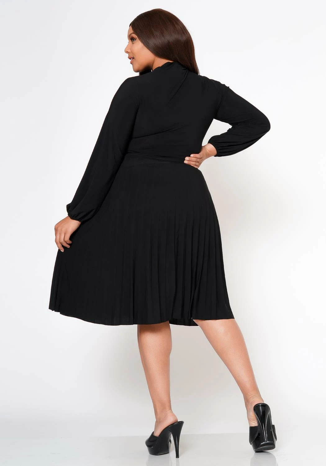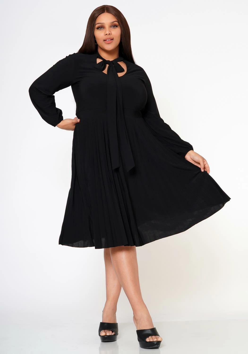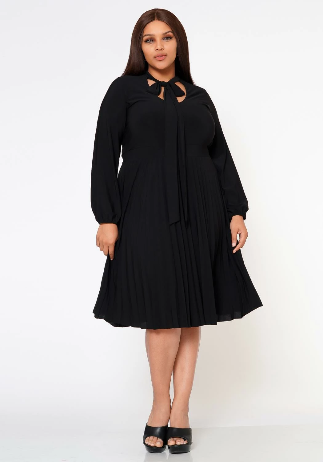 Classy plus size women’s fit & flare dress with pleated design, long sleeves, fitted wrist cuffs, bow collar ascent and v-neck cut out.