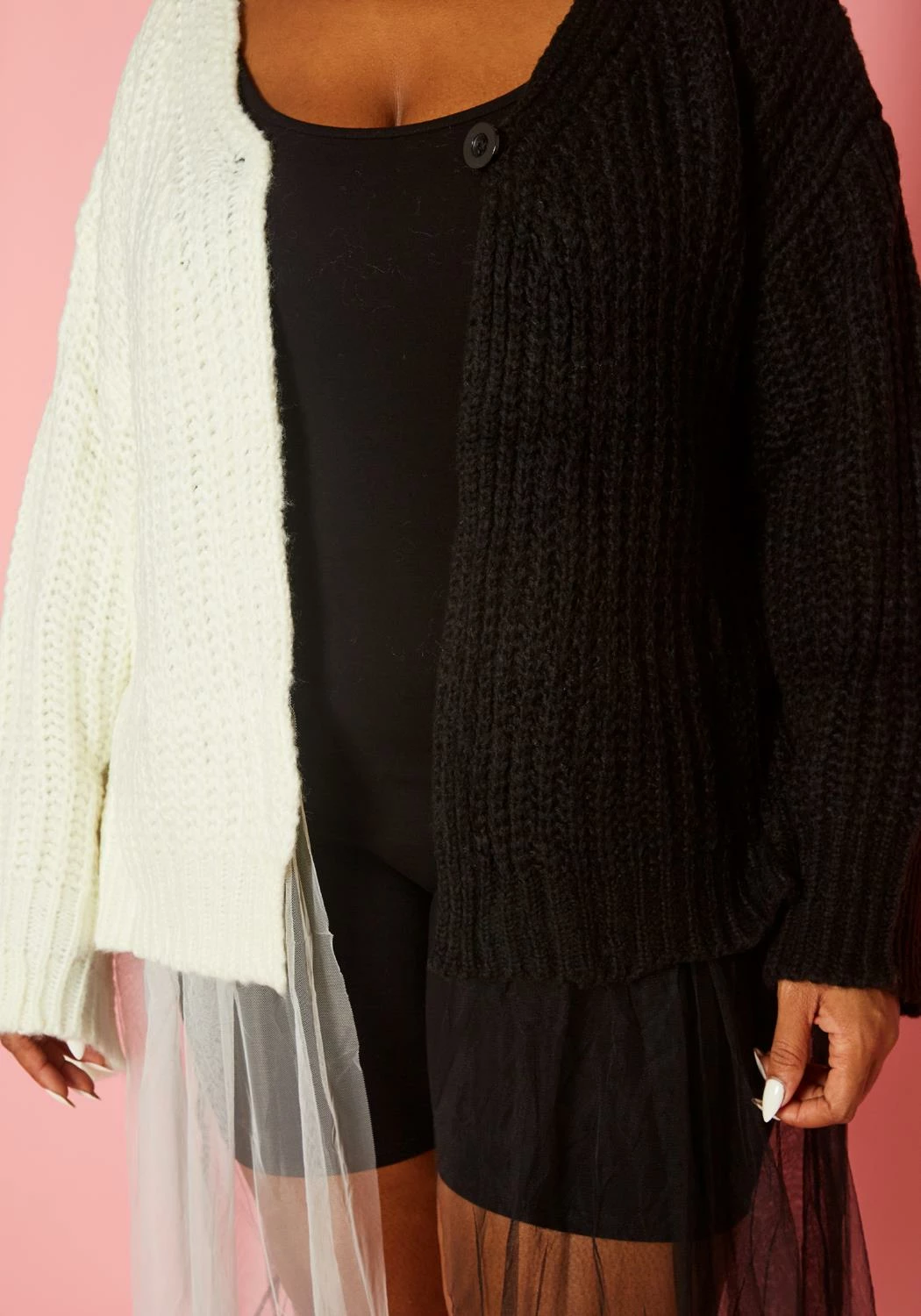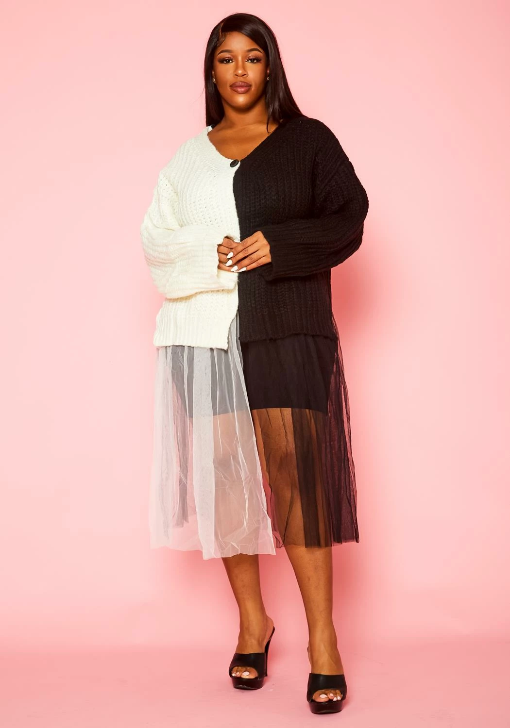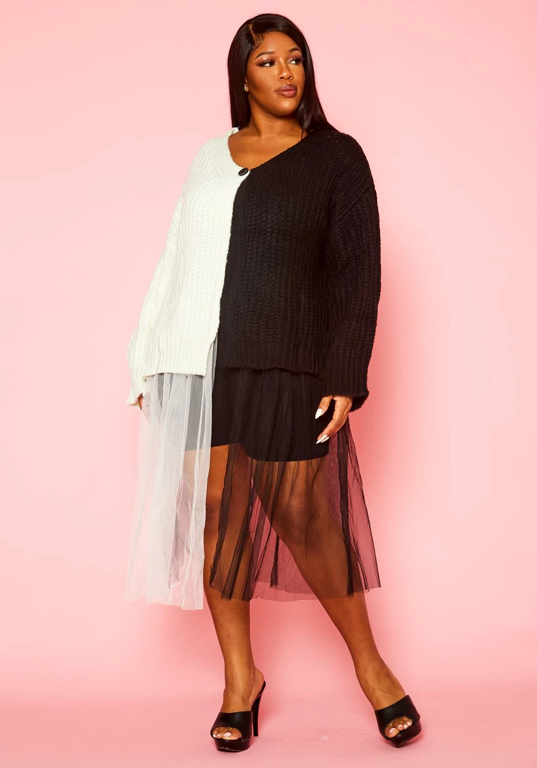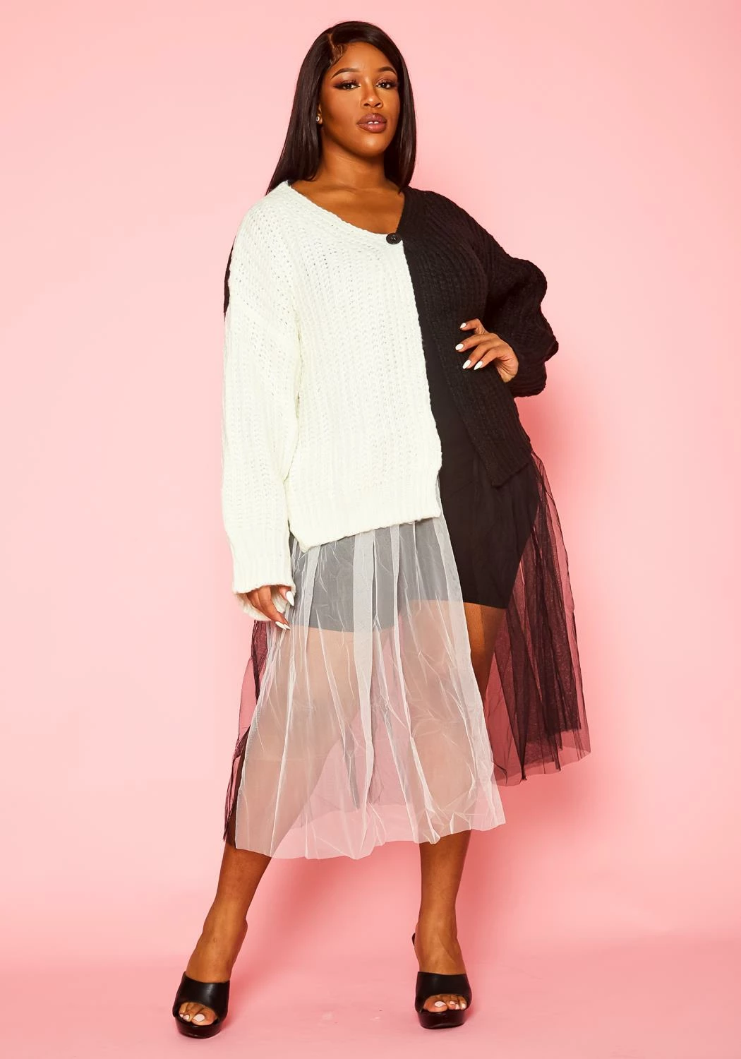 Classic button up v-neck cardigan in cable knit design romanced with a fluttery tulle peplum that enhances the look!