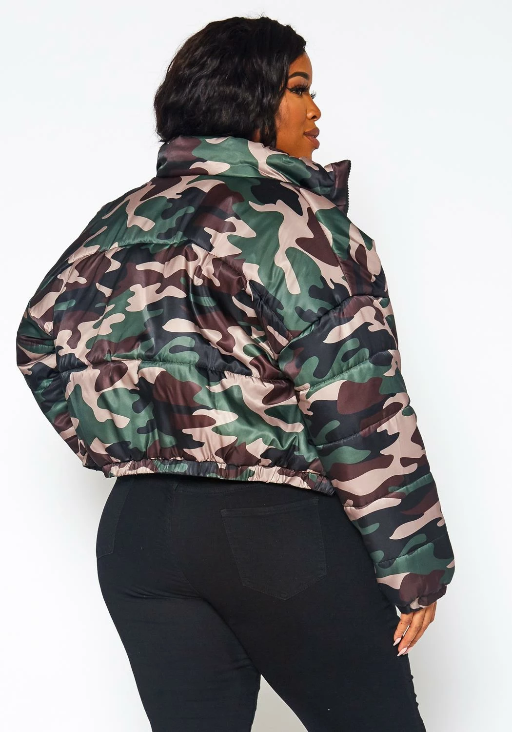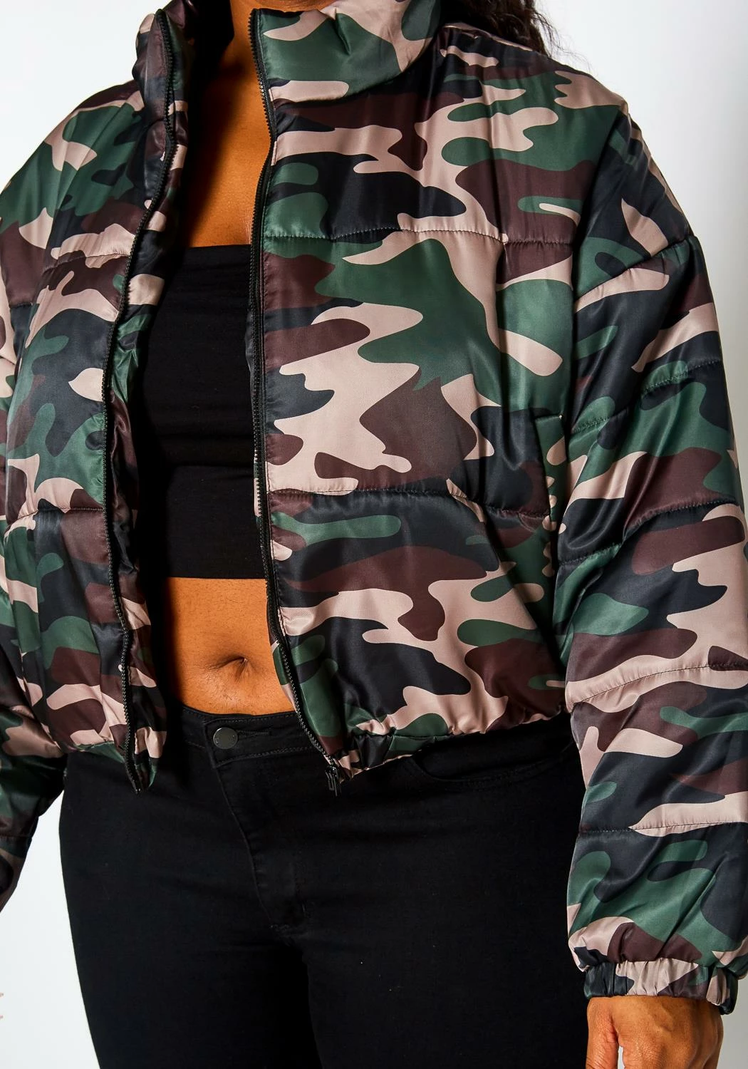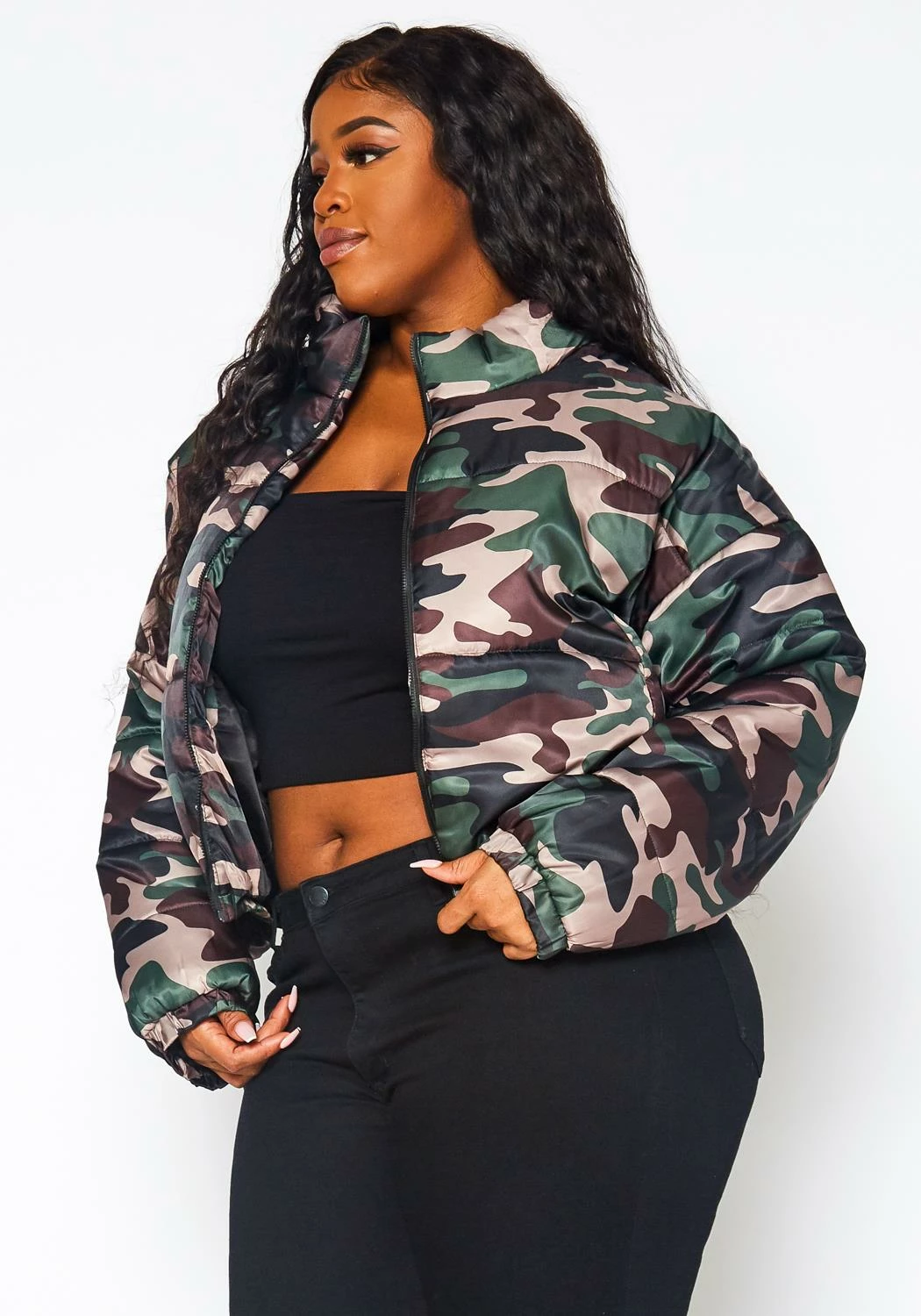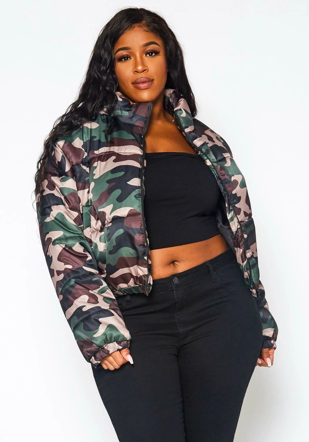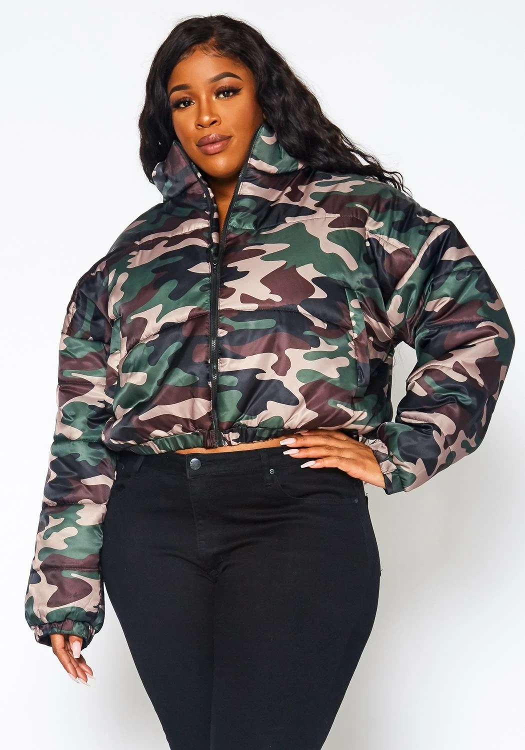 Trendy plus size women’s puffer jacket in high neck style, front zipper closure, cropped fit and side pocket ascent.