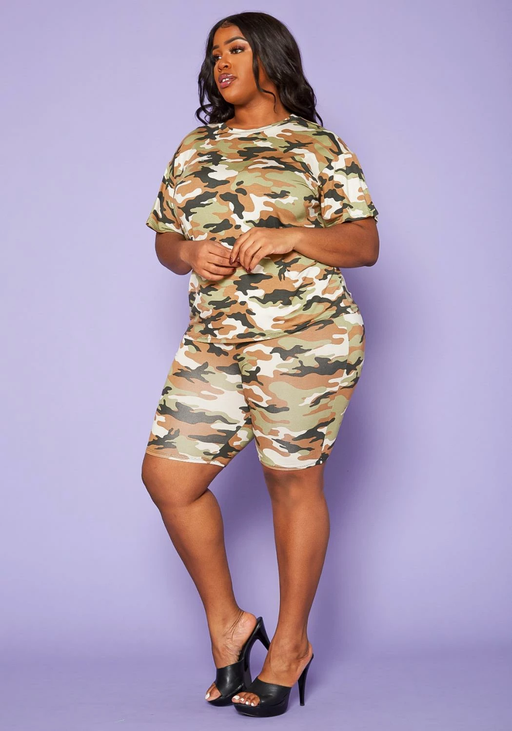Plus size women’s camo print set, featuring a short sleeve crew neck t-shirt and high waist biker shorts.