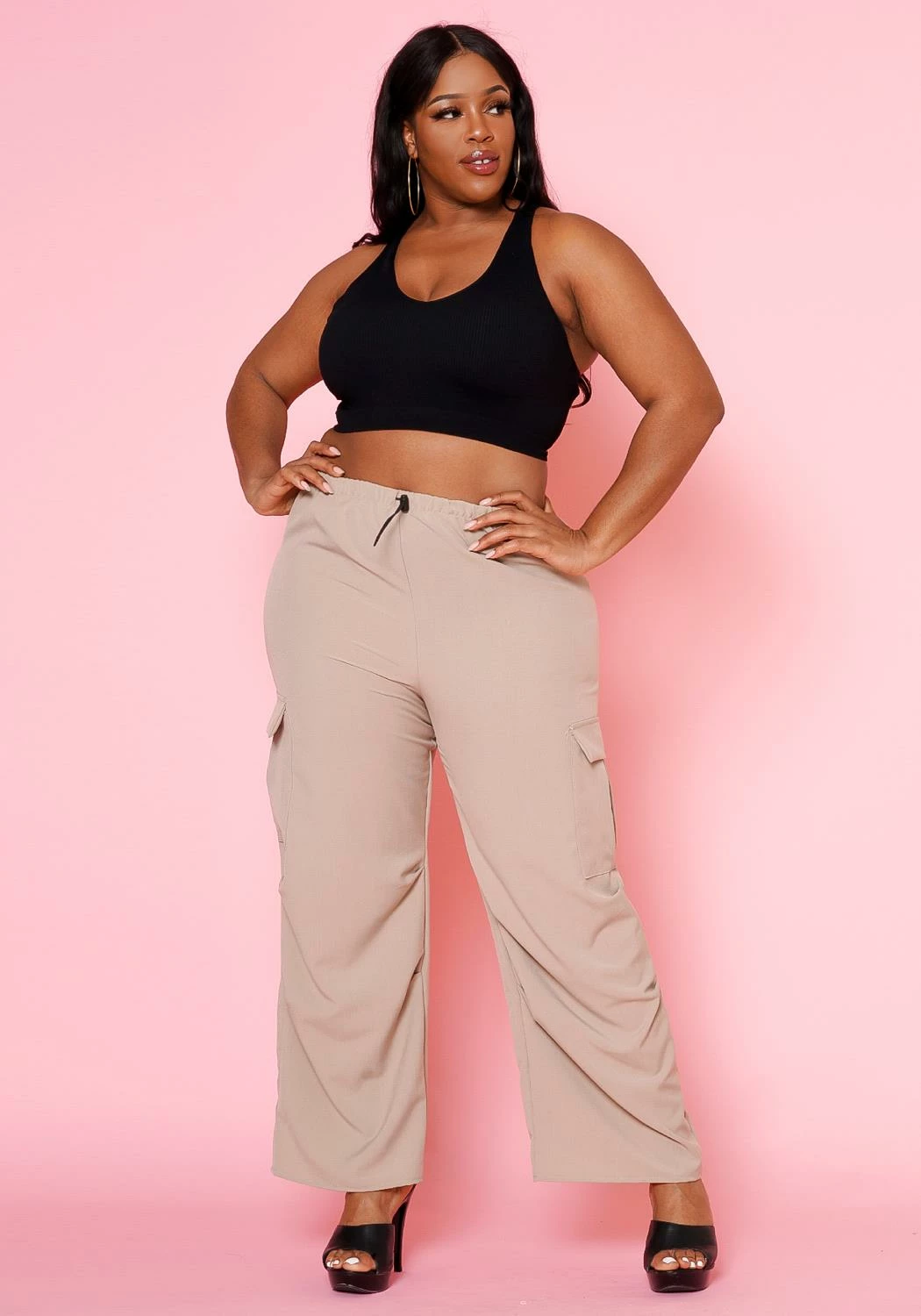 Plus size women’s trendy cargo pants in straight leg fit, waist drawstring hem and cargo pockets.