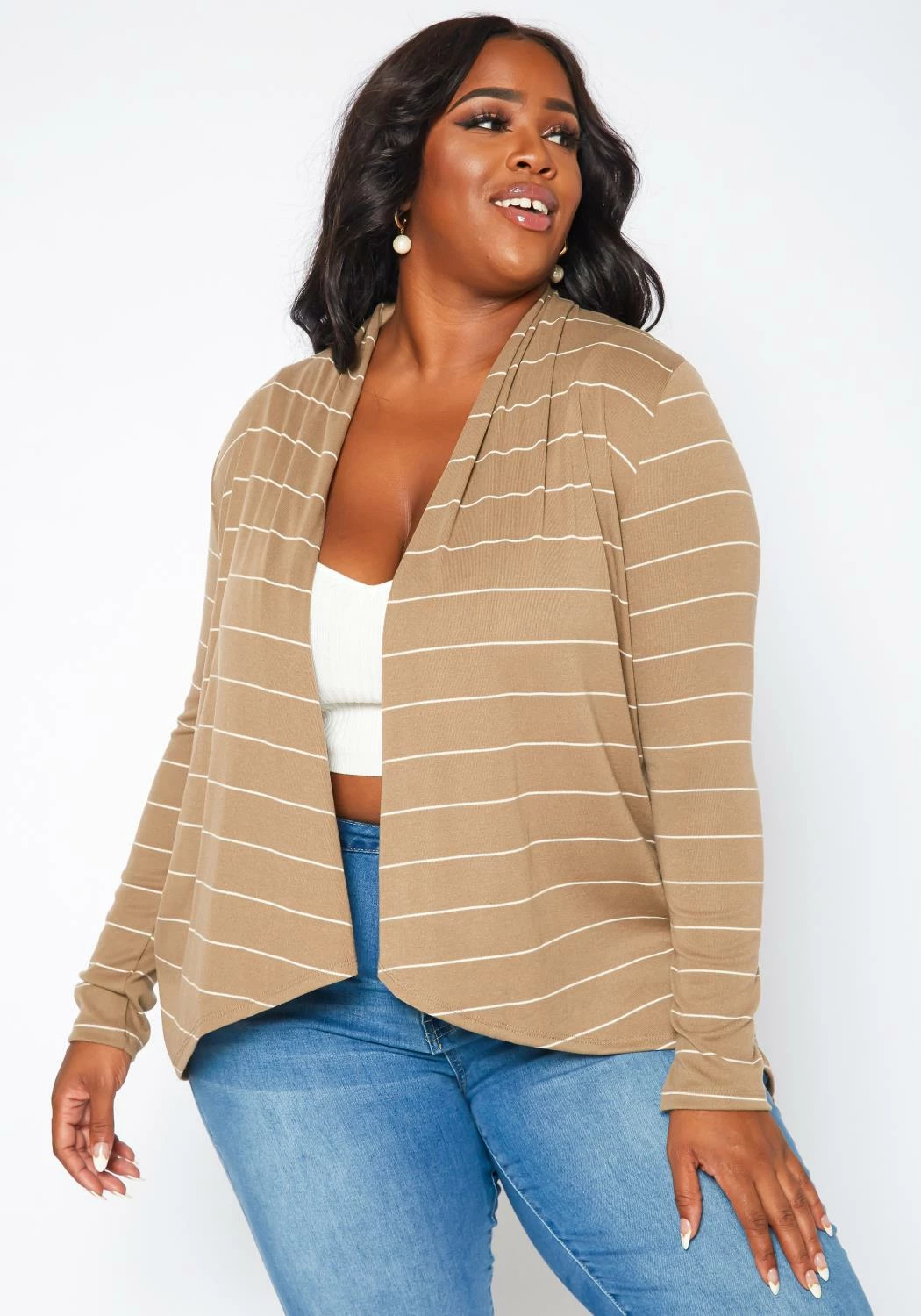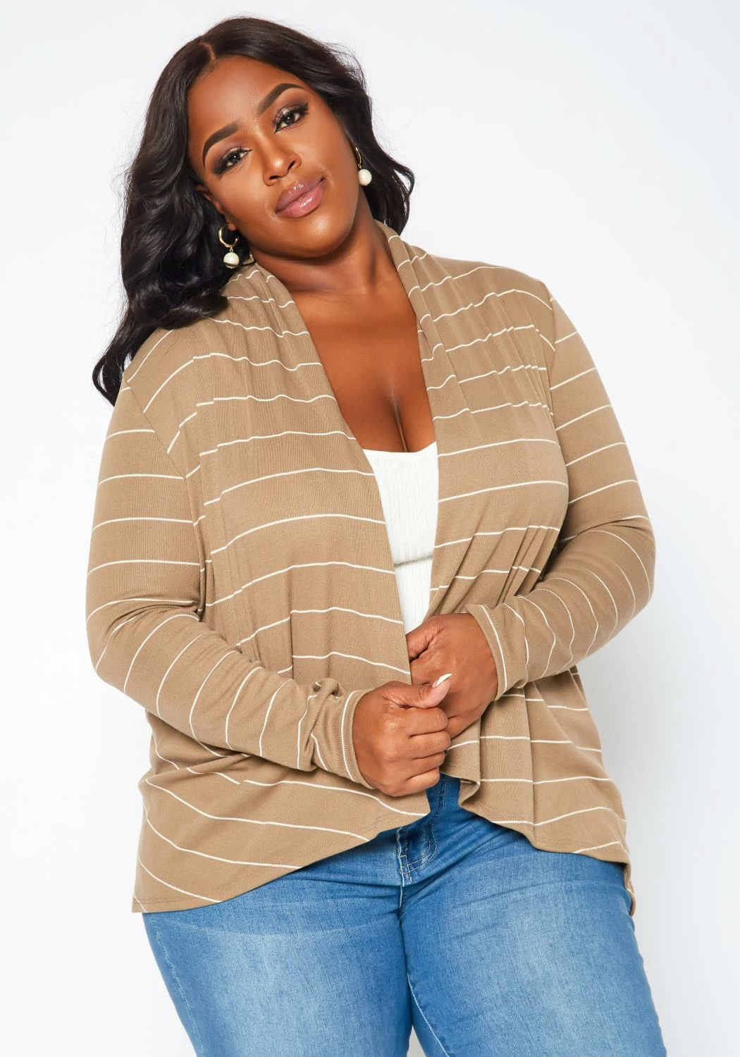 Casual plus size women’s cardigan in striped pattern, open front style, drape front hem and fitted long sleeves.