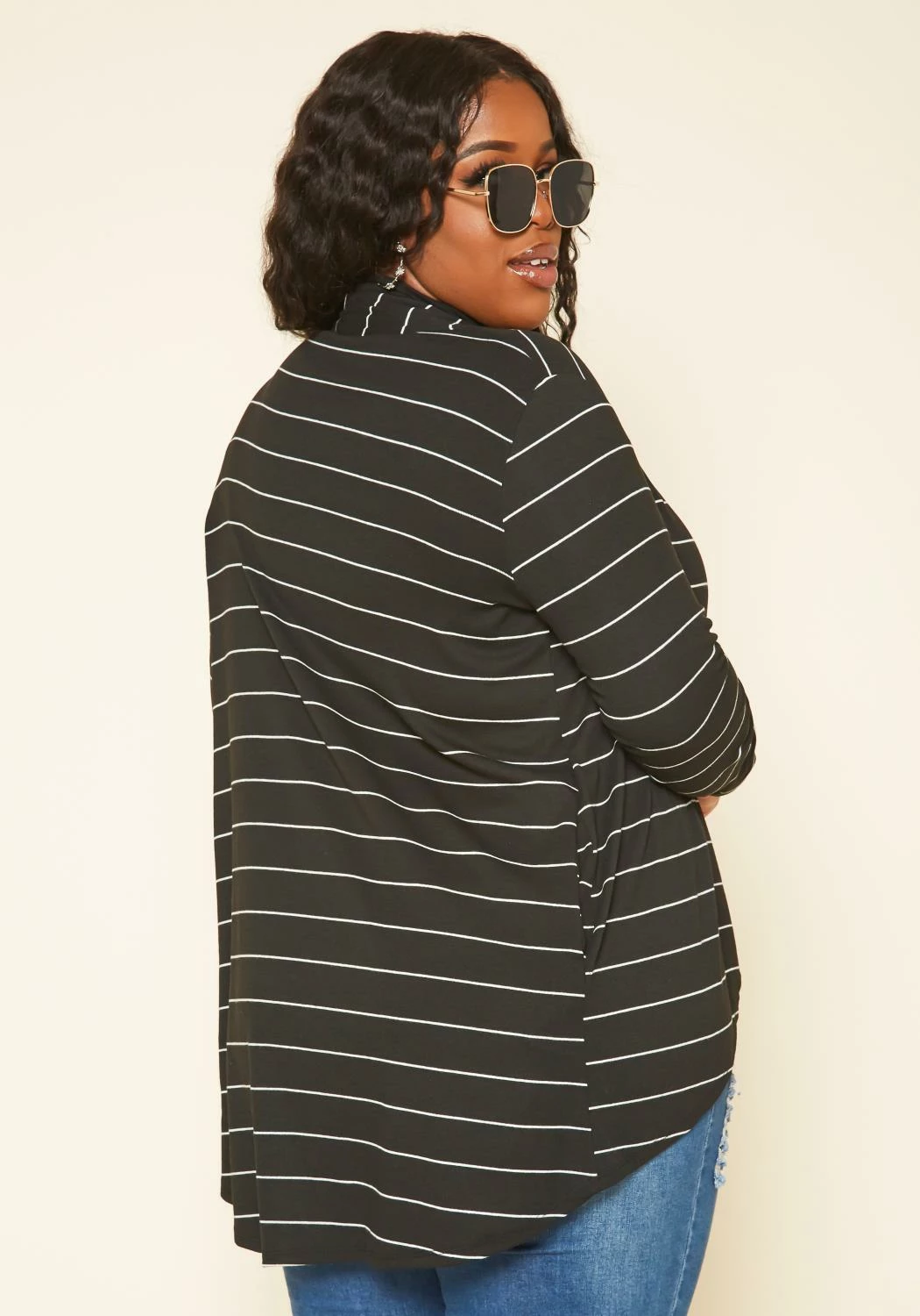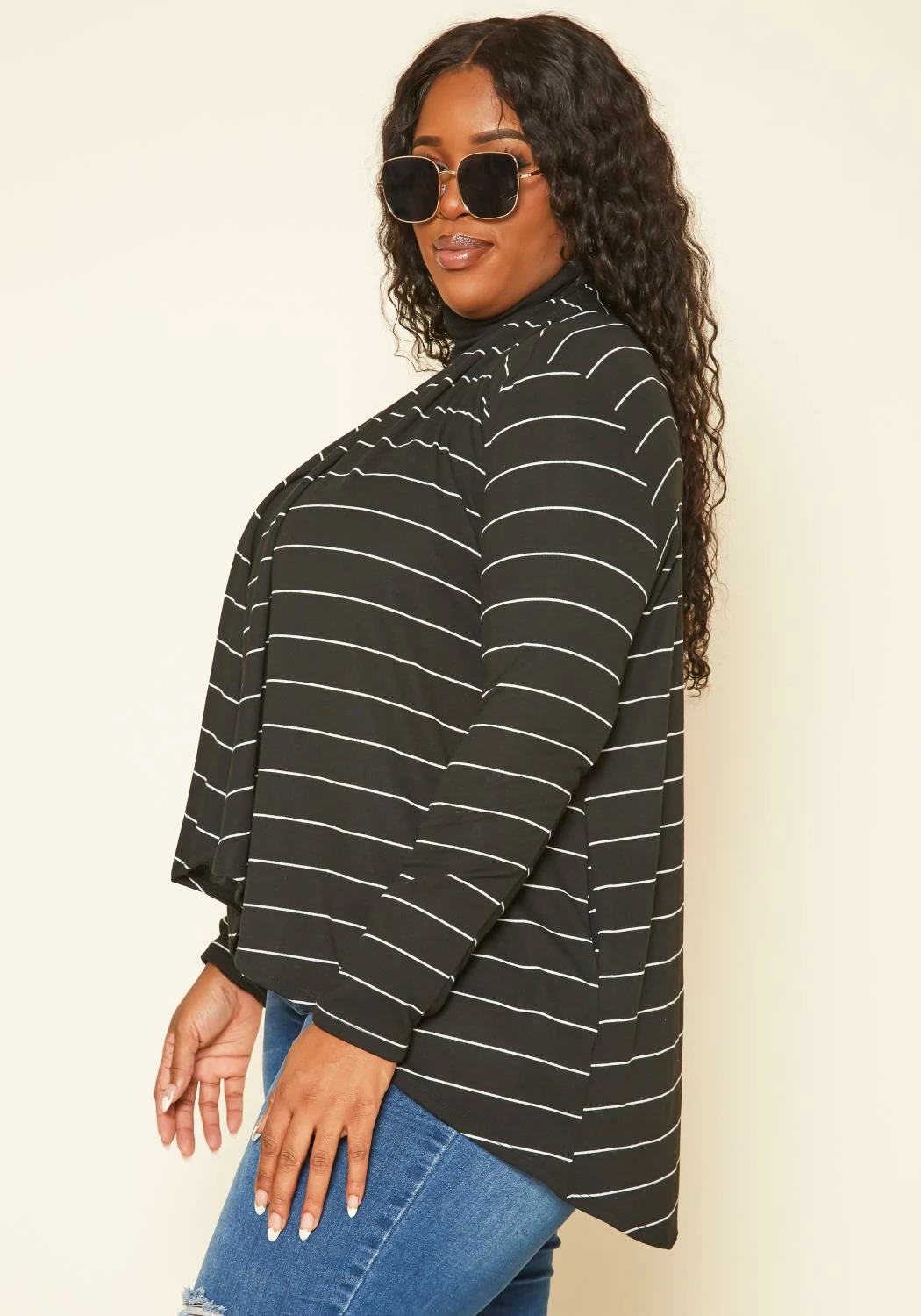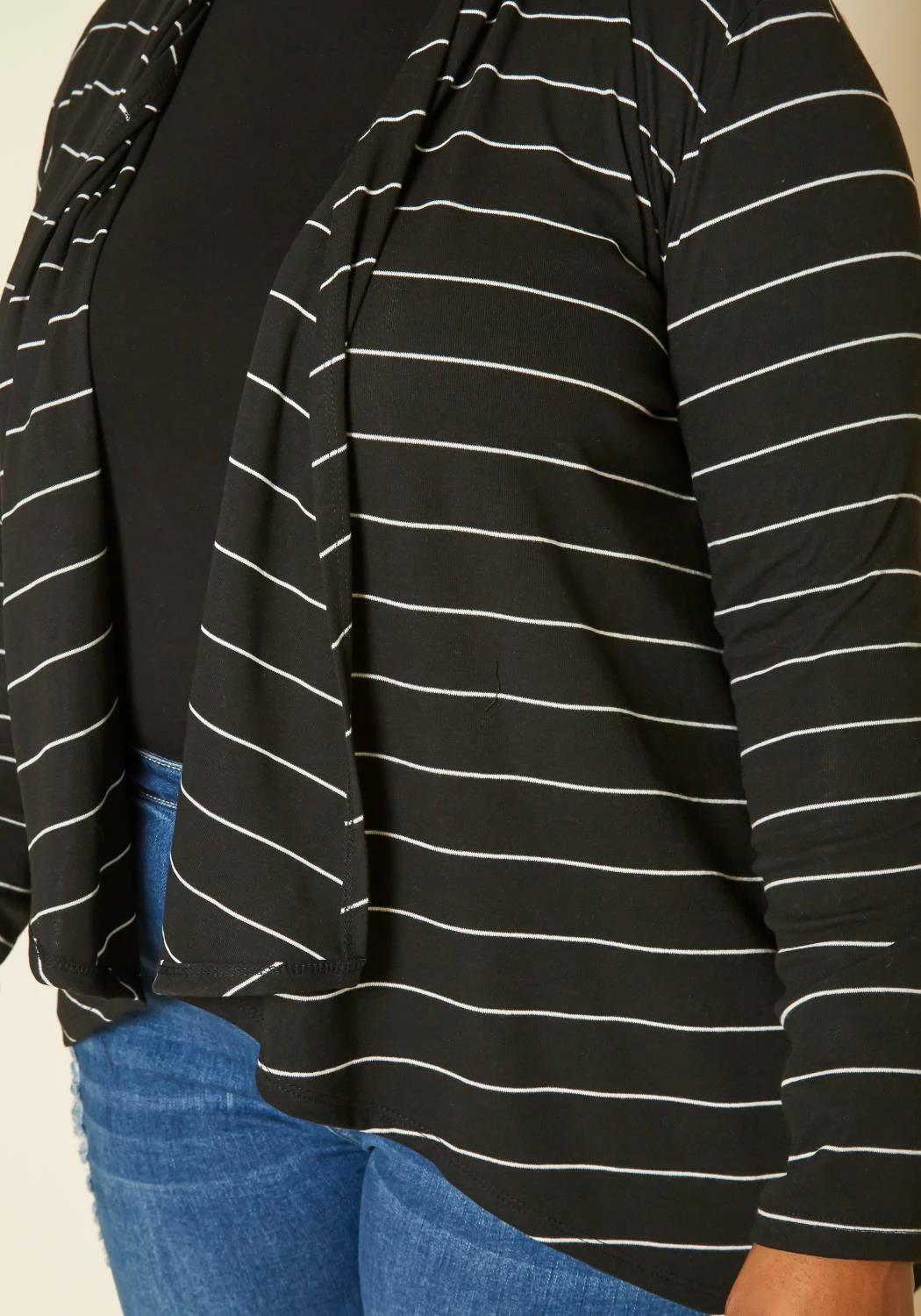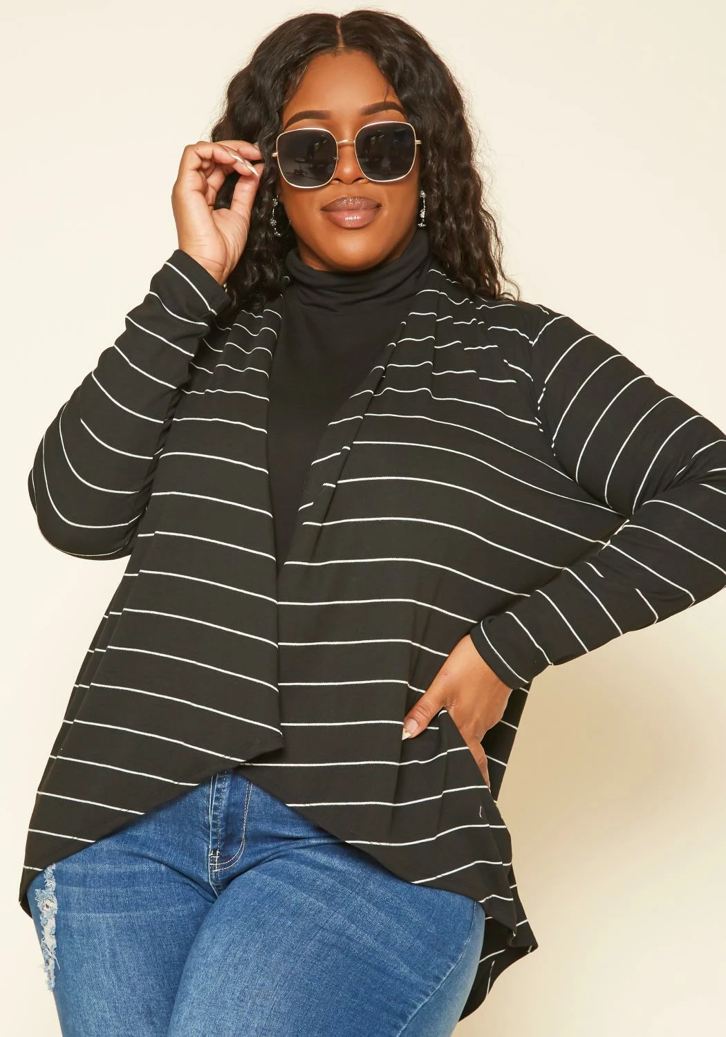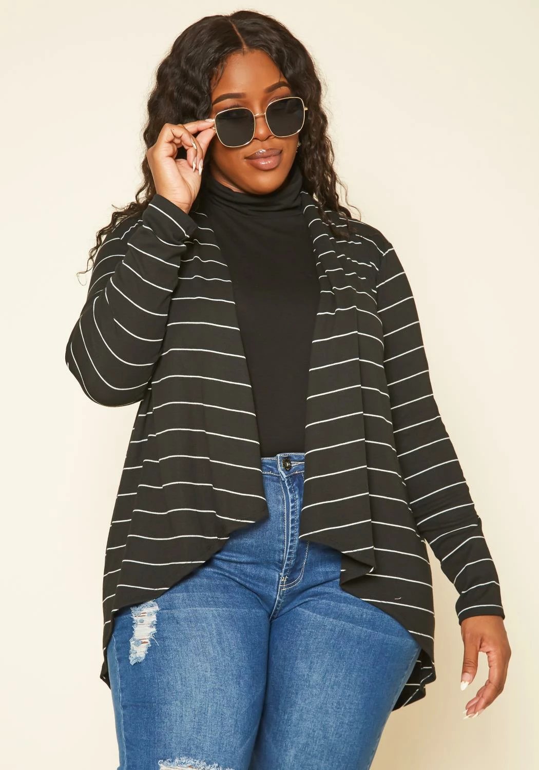 Casual plus size women’s cardigan in striped pattern, open front style, drape front hem and fitted long sleeves.