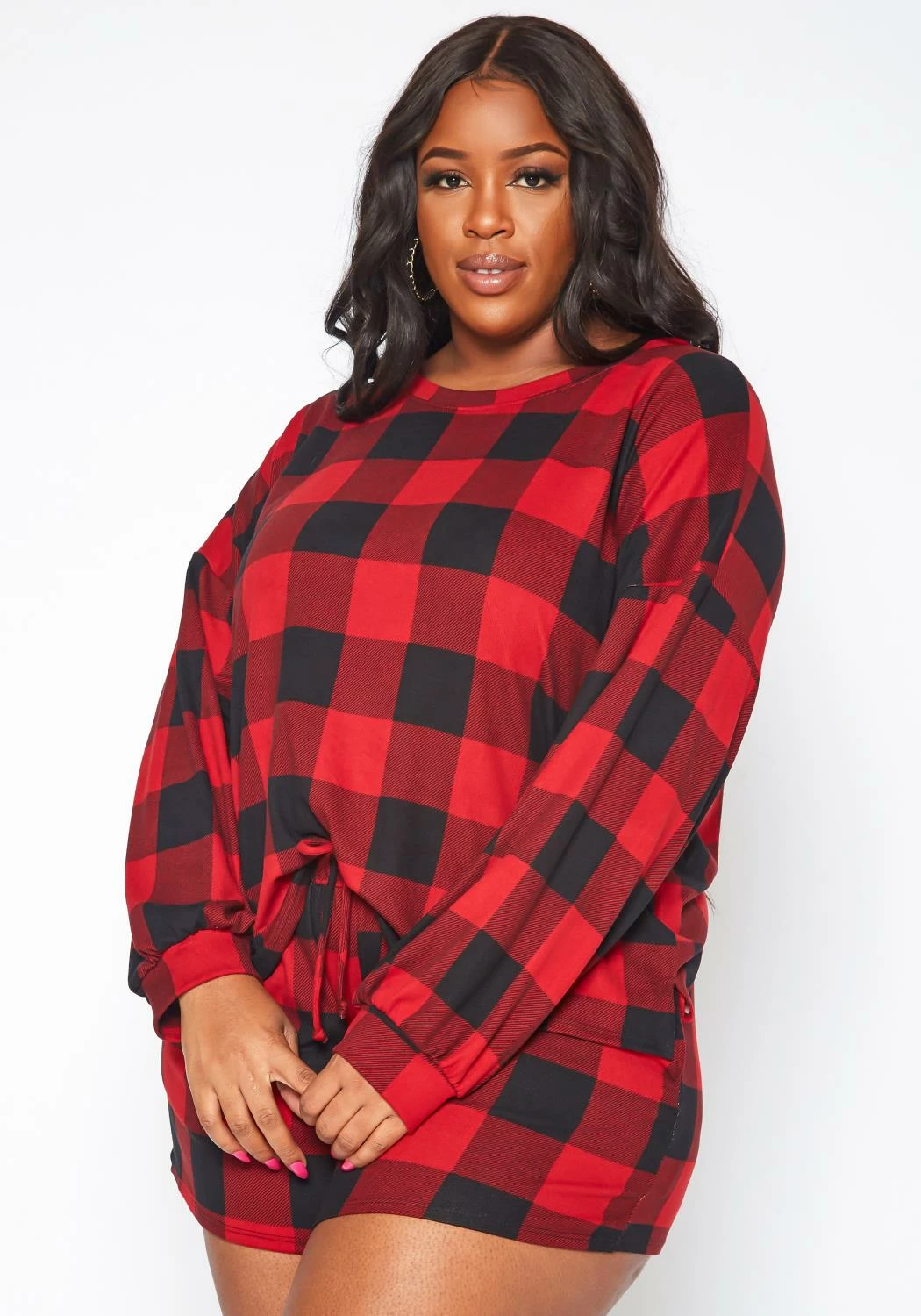 Stylish lounge set in checkered plaid print for plus size women. Features a soft, relaxed fit sweater and waistline drawstring hem shorts with pockets.