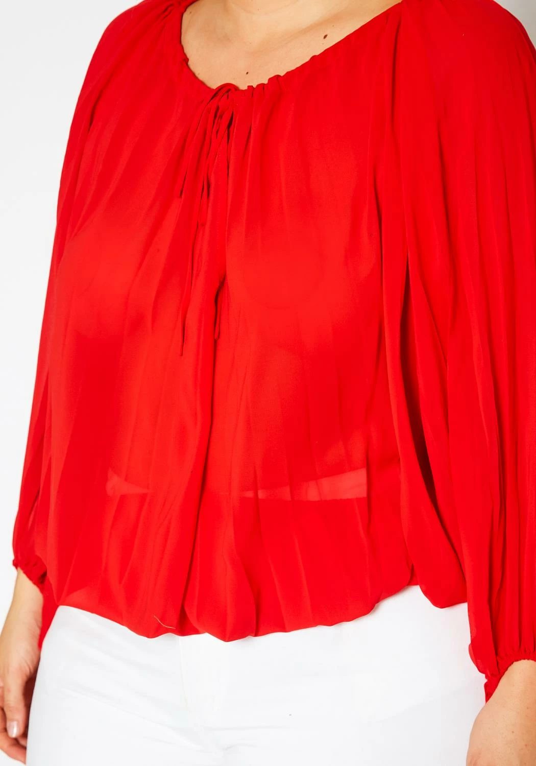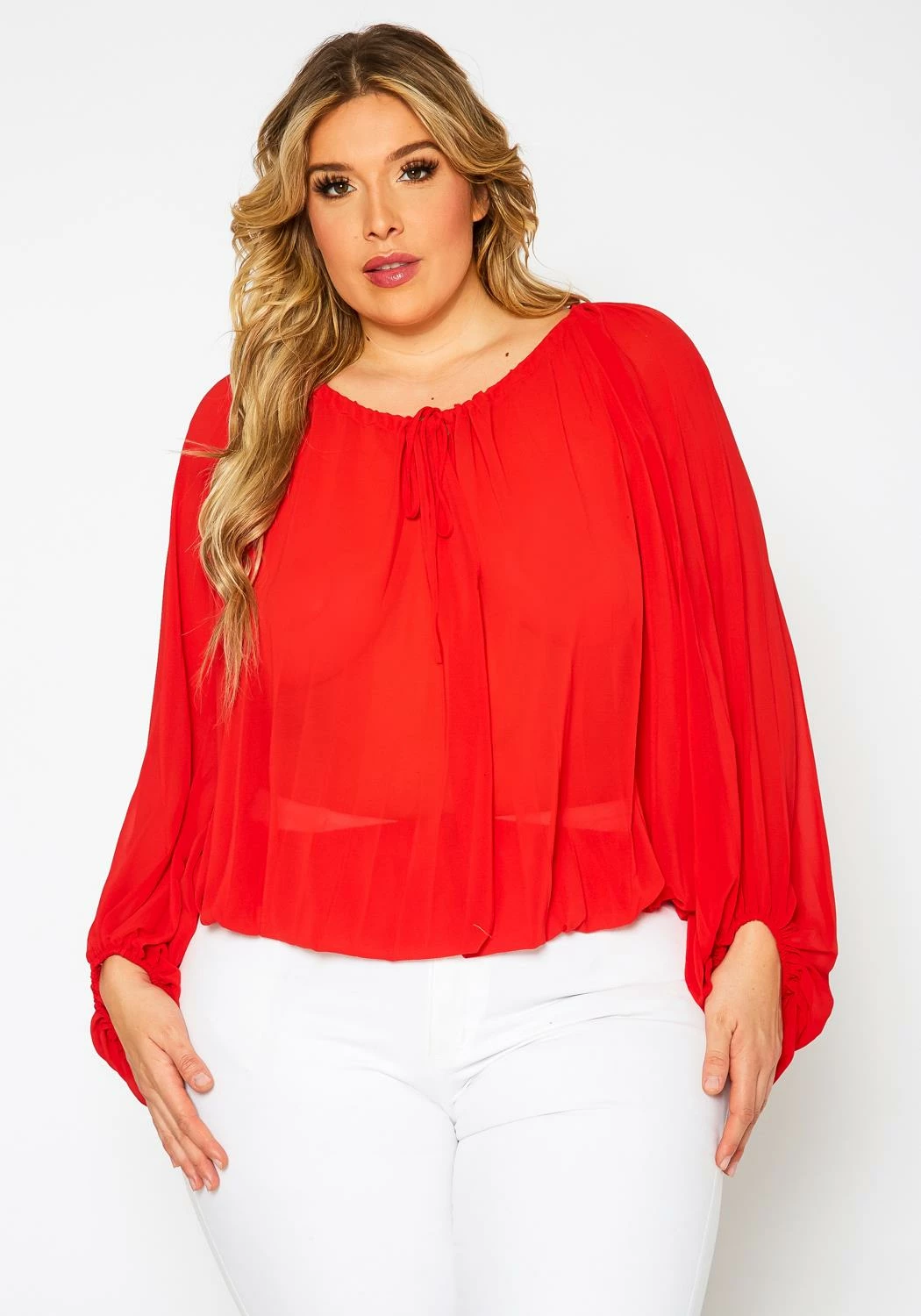 Lovely plus size women’s blouse with front tie detail, dolman long sleeves and ruched details.