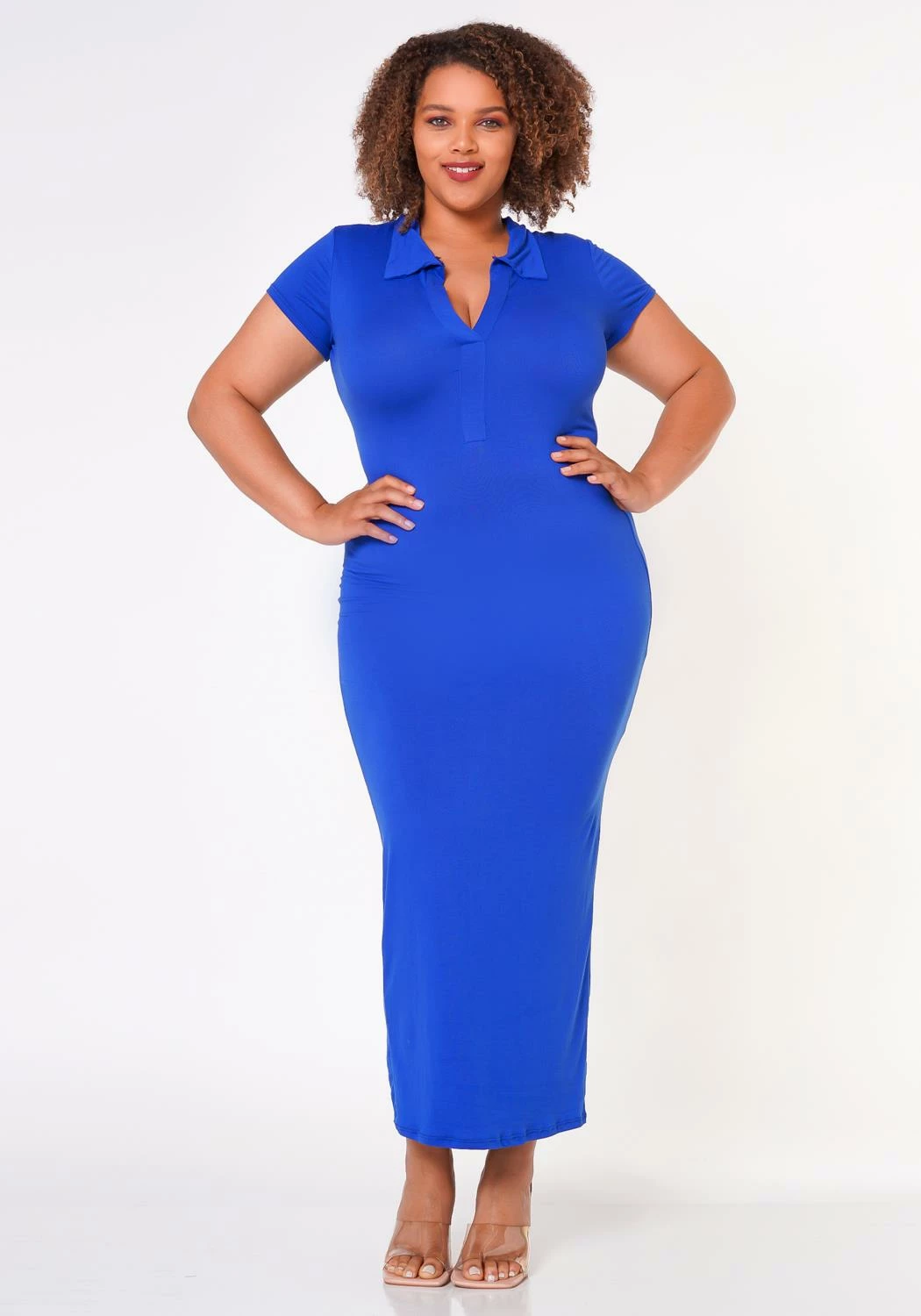 Summer essential plus size women’s bodycon maxi dress in collar v-neck style, short sleeve and form fitting soft to the touch material.