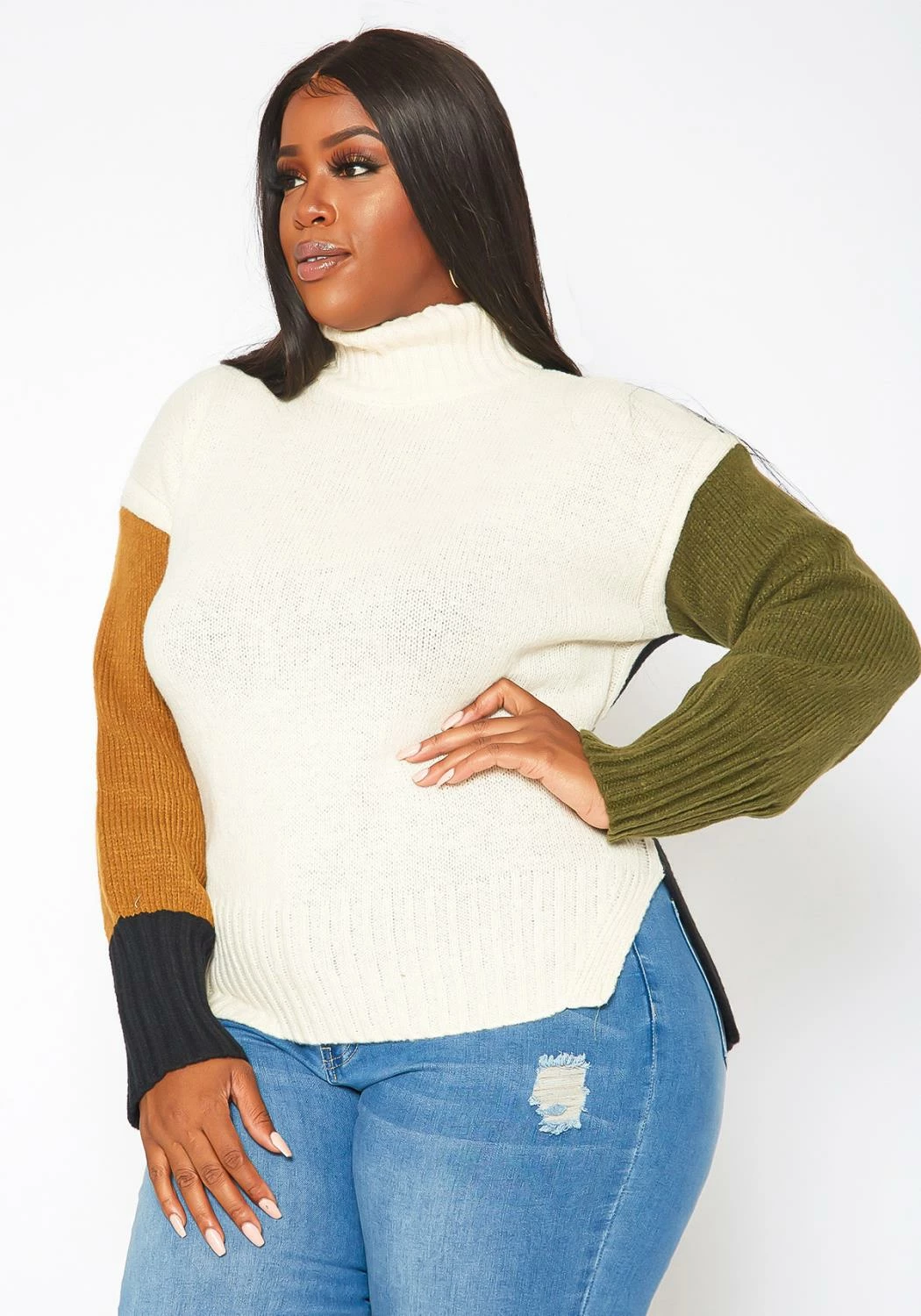 Winter must have knit sweater for plus size women which features a color block design, high neck style, relaxed fit long sleeves and side slit hem.