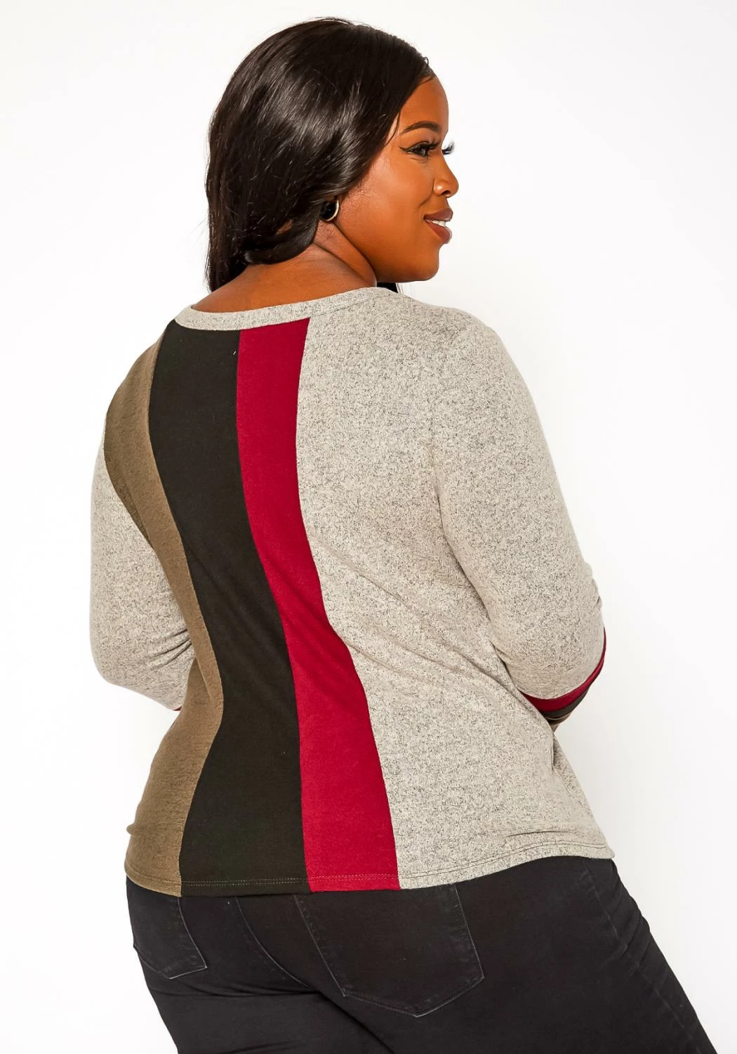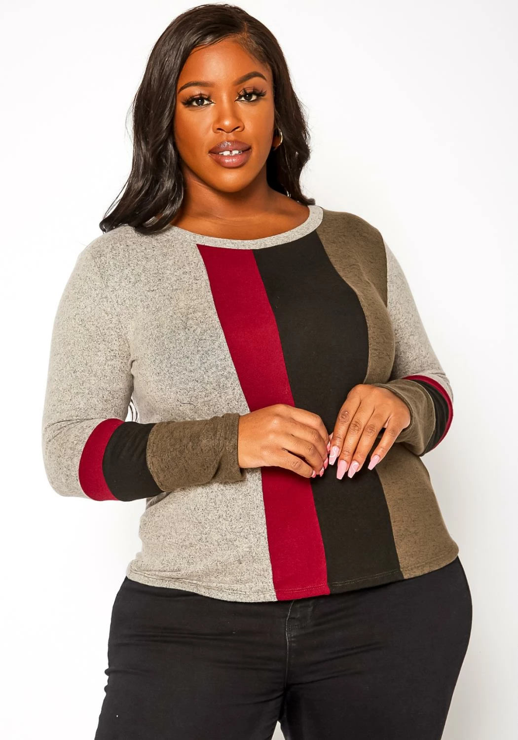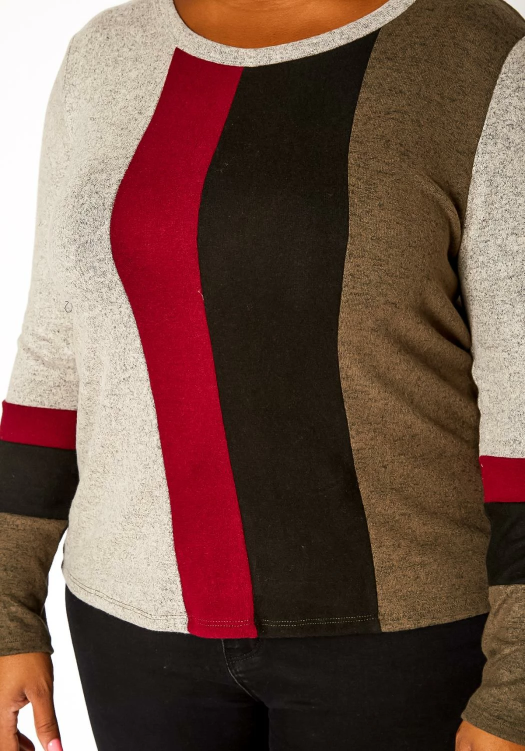 Plus size women’s casual shirt in color block design, crew neck style and long sleeves.