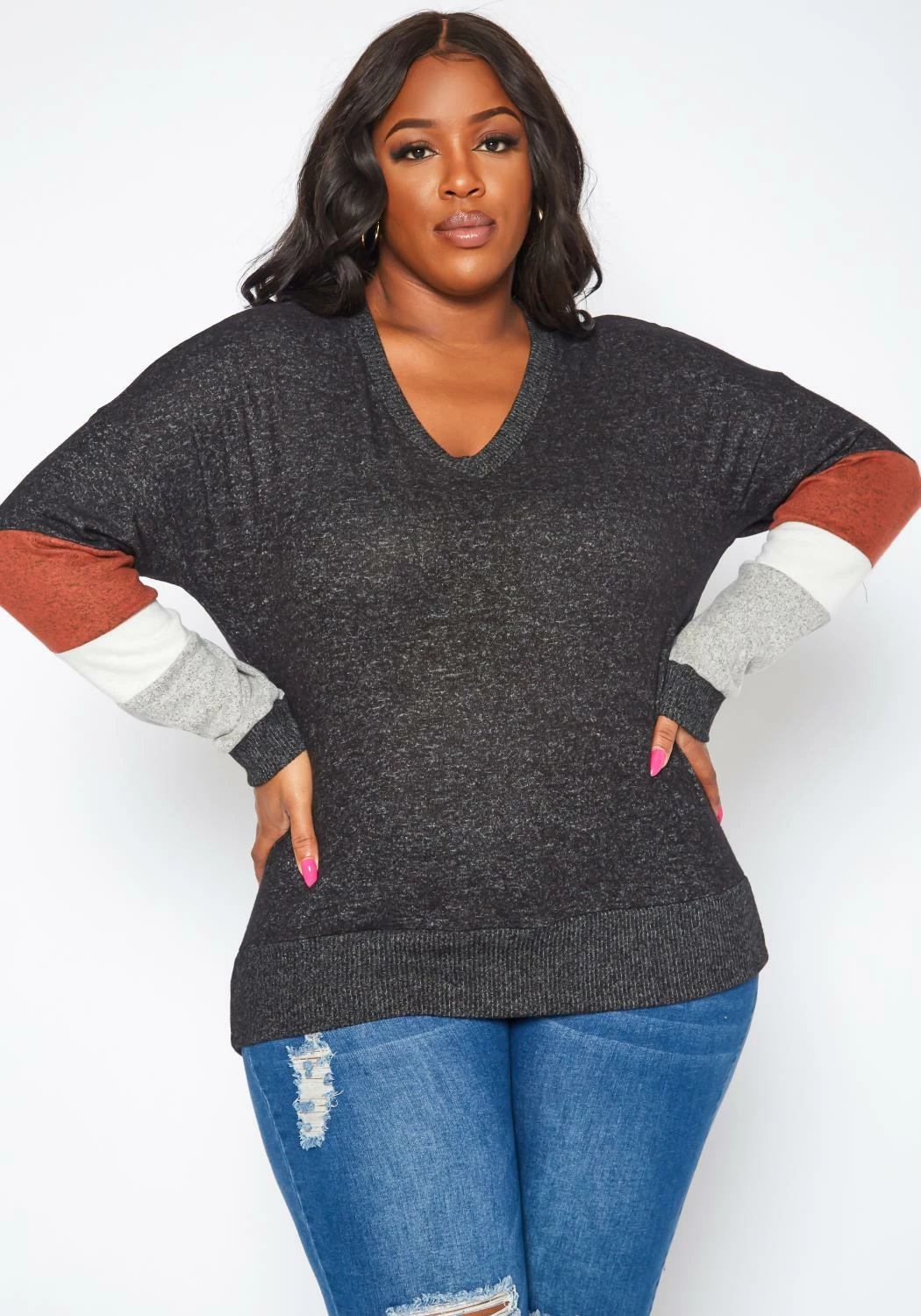 Casual plus size women’s sweater with color block long sleeves and v-neck style.
