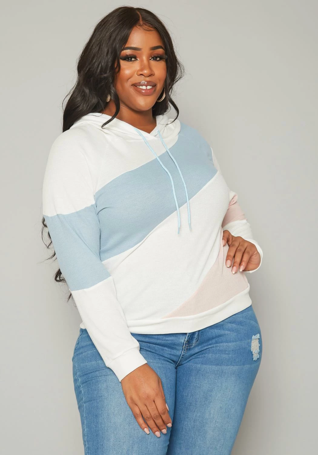 Casual plus size women’s sweater in hooded style, ribbed knit and color block design.