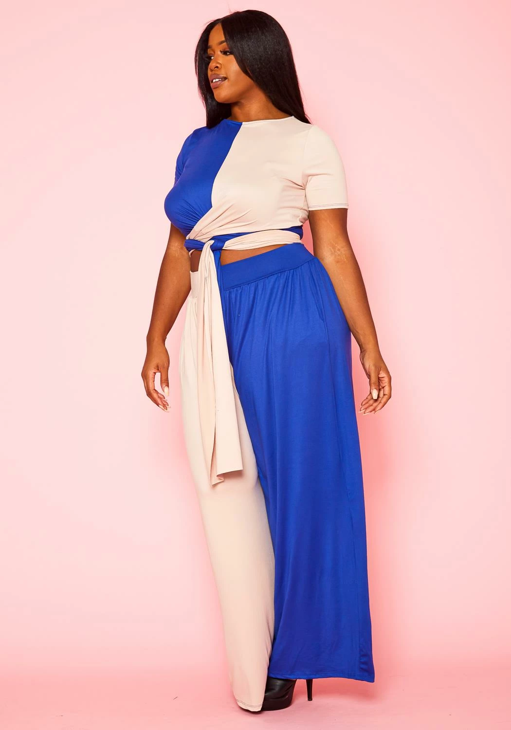 Trendy plus size women’s matching set which features a short sleeve crop top with unique tie front hem and matching high waist wide flare pants.