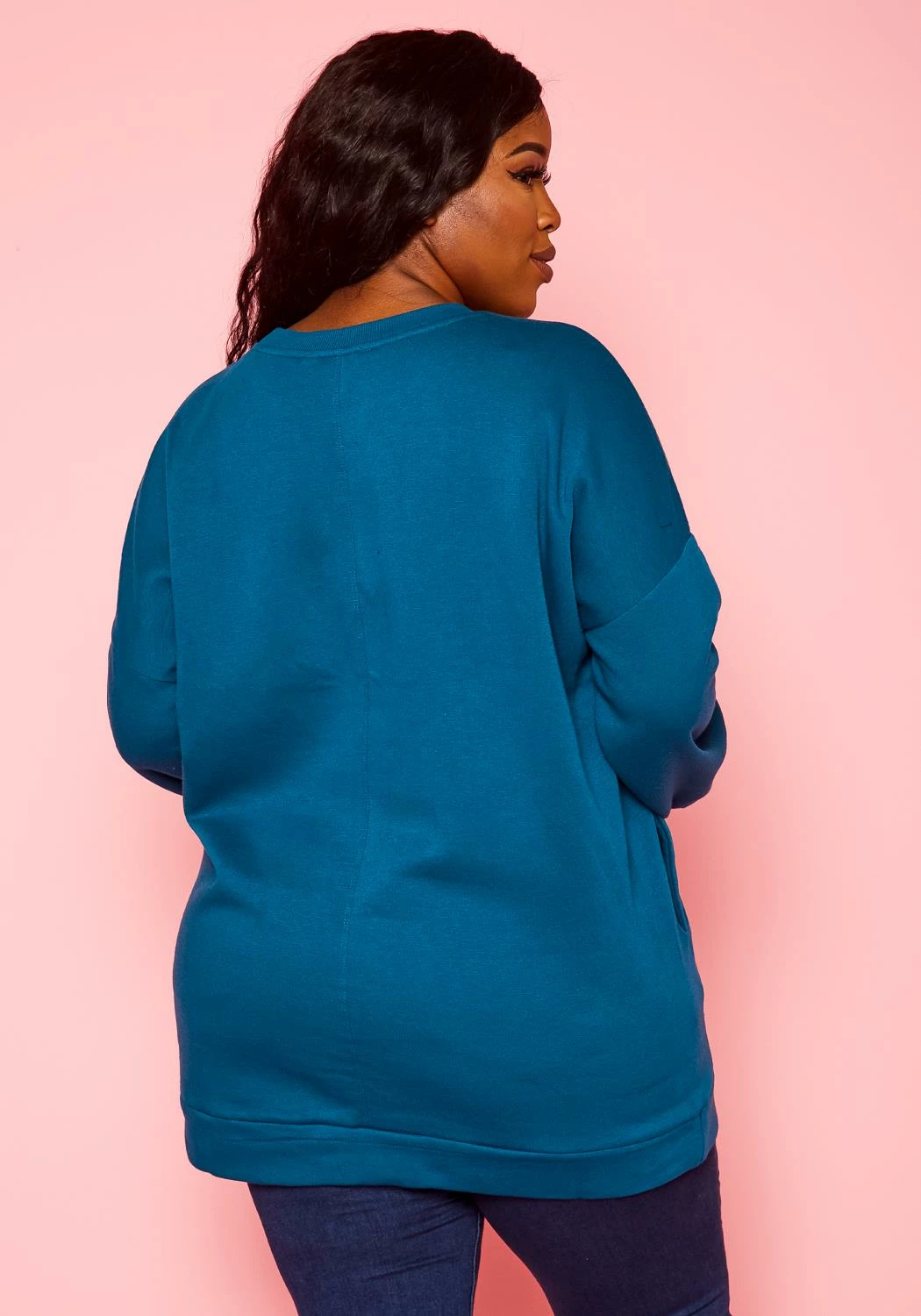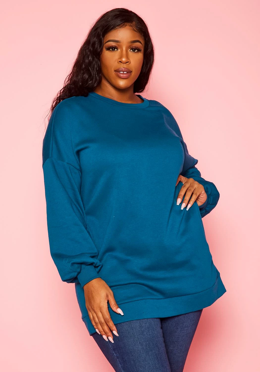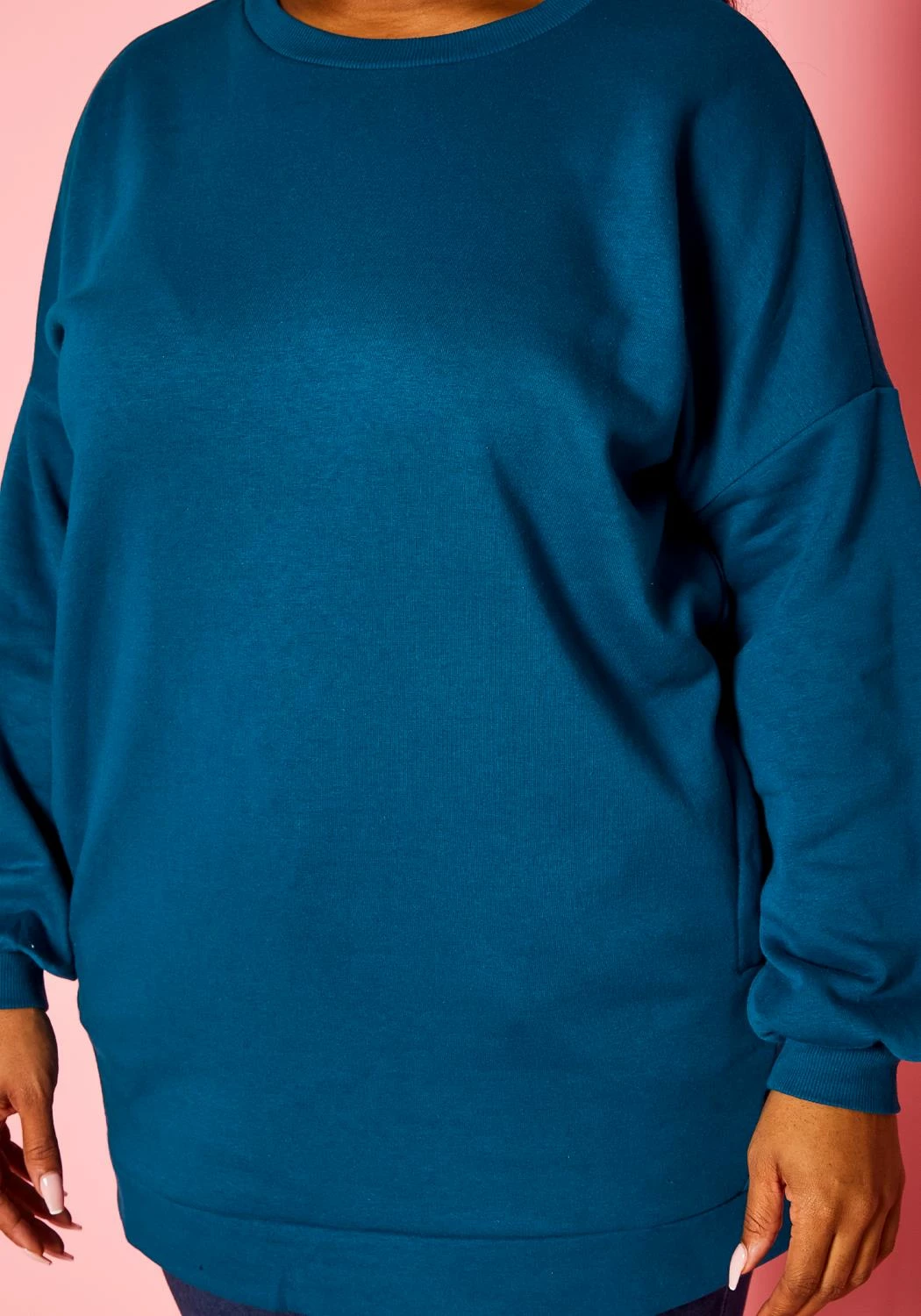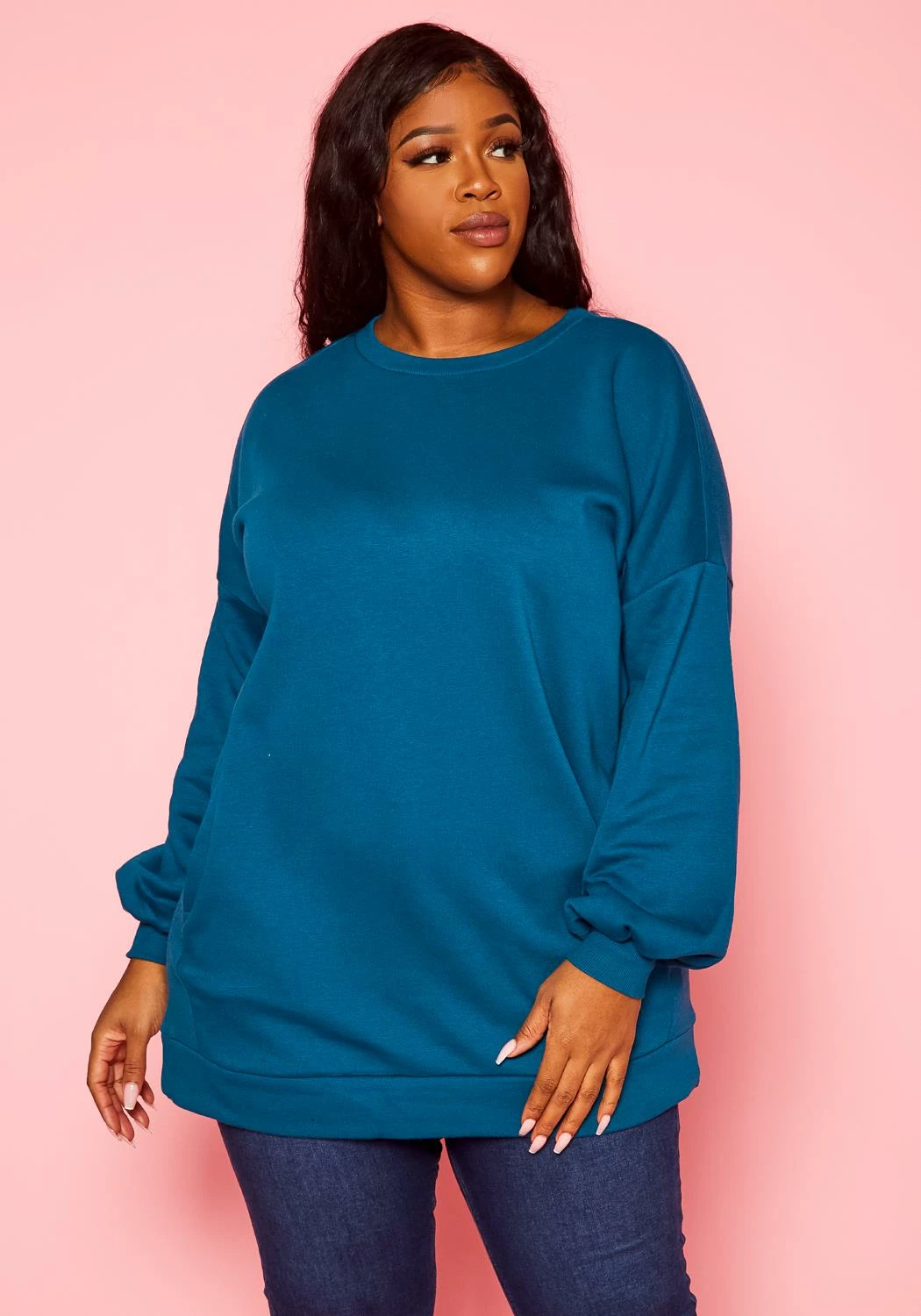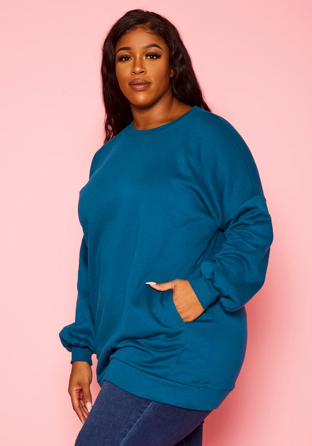Basic plus size women’s sweater in oversized fitting, crew neck style, fitted wrist cuffs and pocket hem.