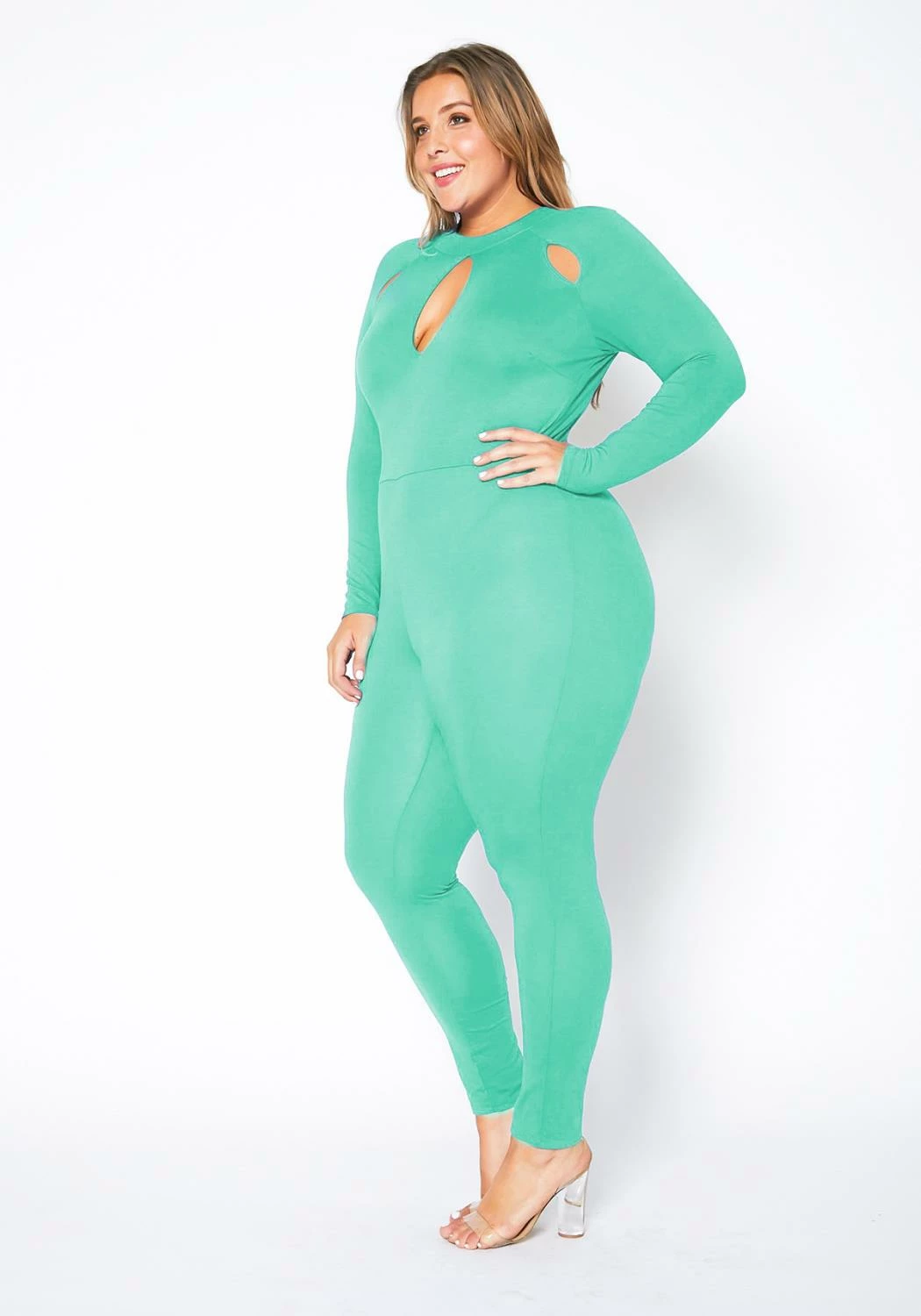 Flirty plus size women’s bodycon jumpsuit with cut-out design, fitted long sleeves, mock neck style and back zipper closure.