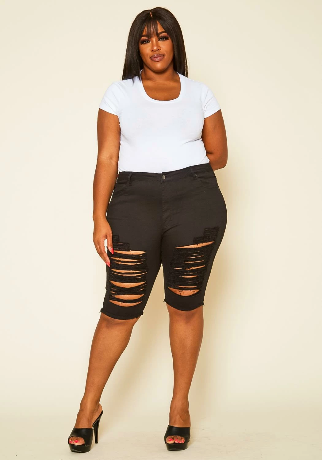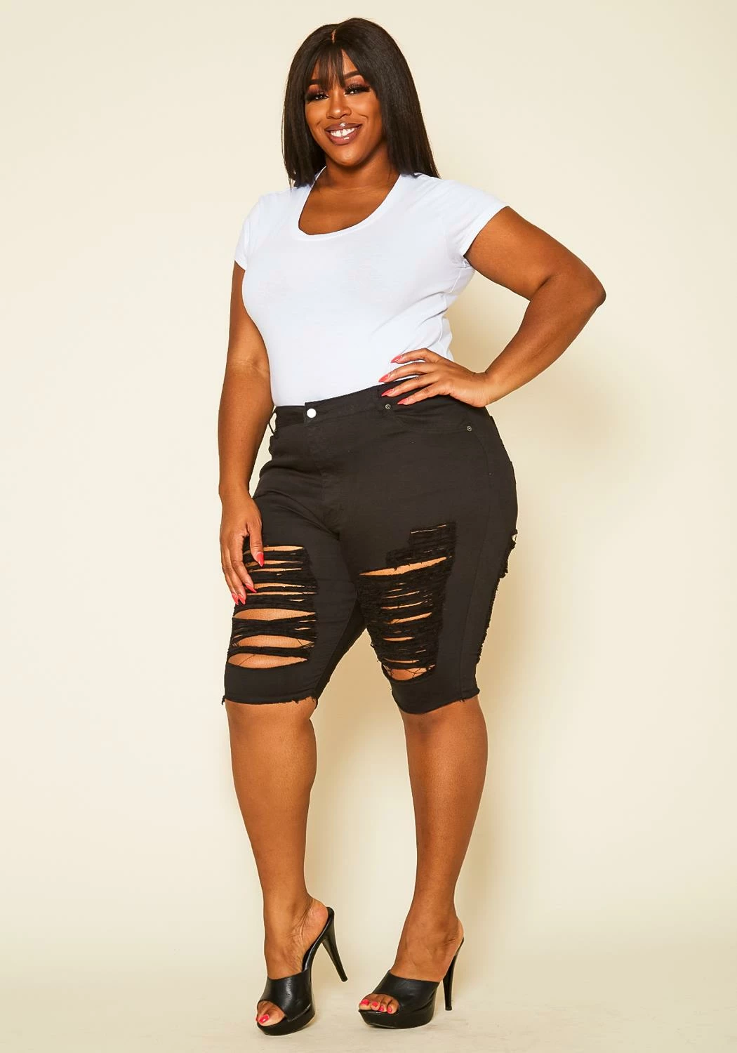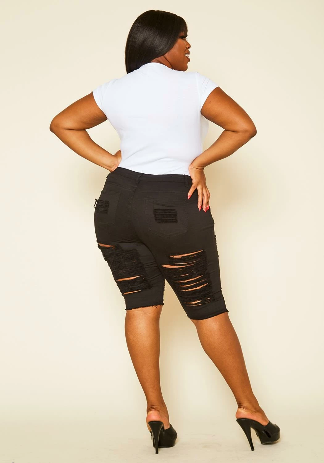 Plus size women’s trendy summer bermuda shorts in blue wash denim, high waist style, front/back distressed details, pocket ascent and belt loop holes.