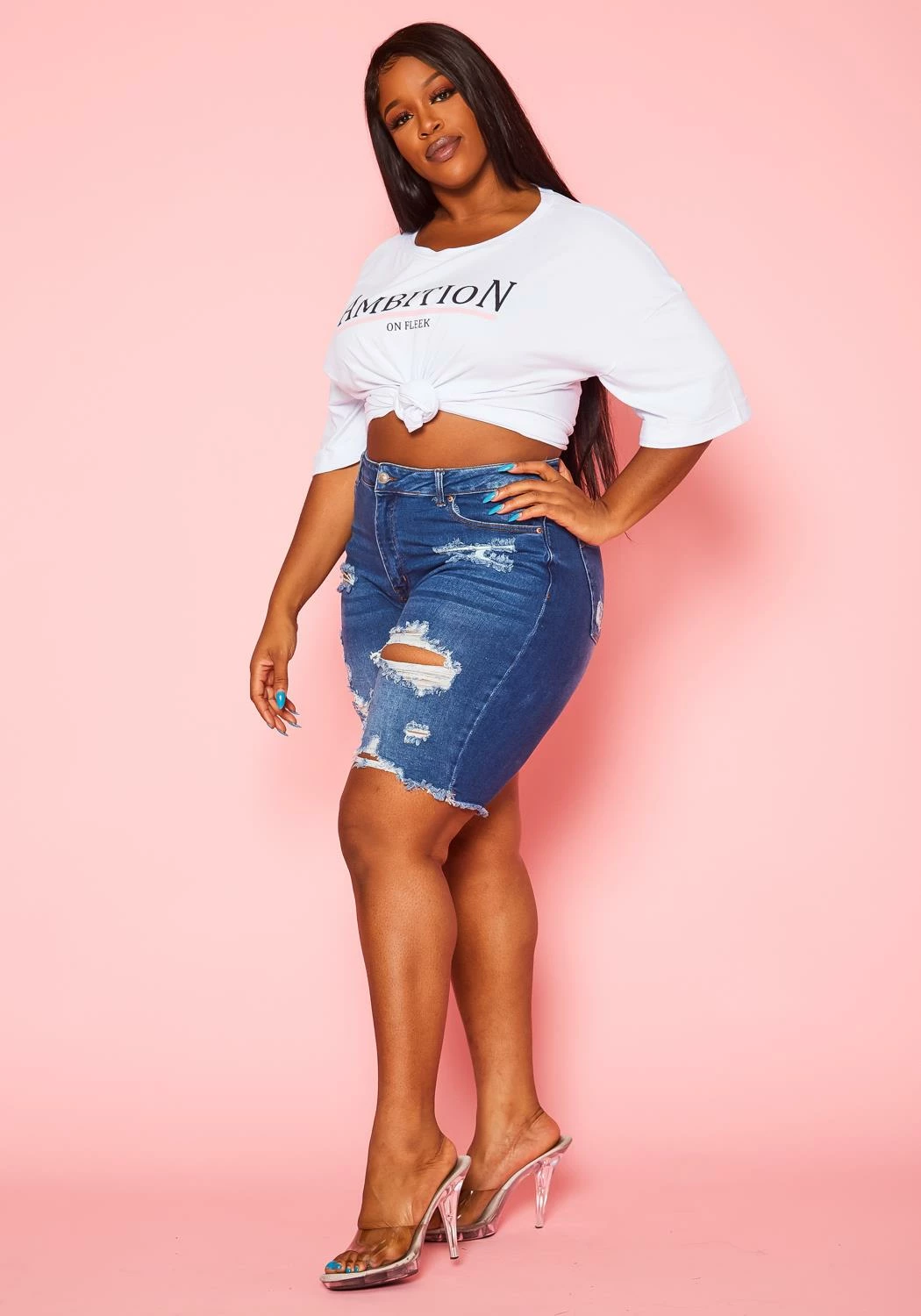 Plus size women’s shorts in denim style, featuring distressed detail, front and back pockets & zipper/button closure.