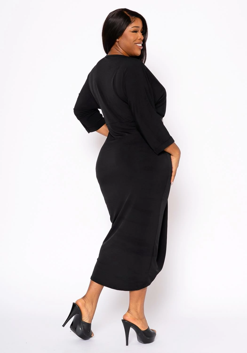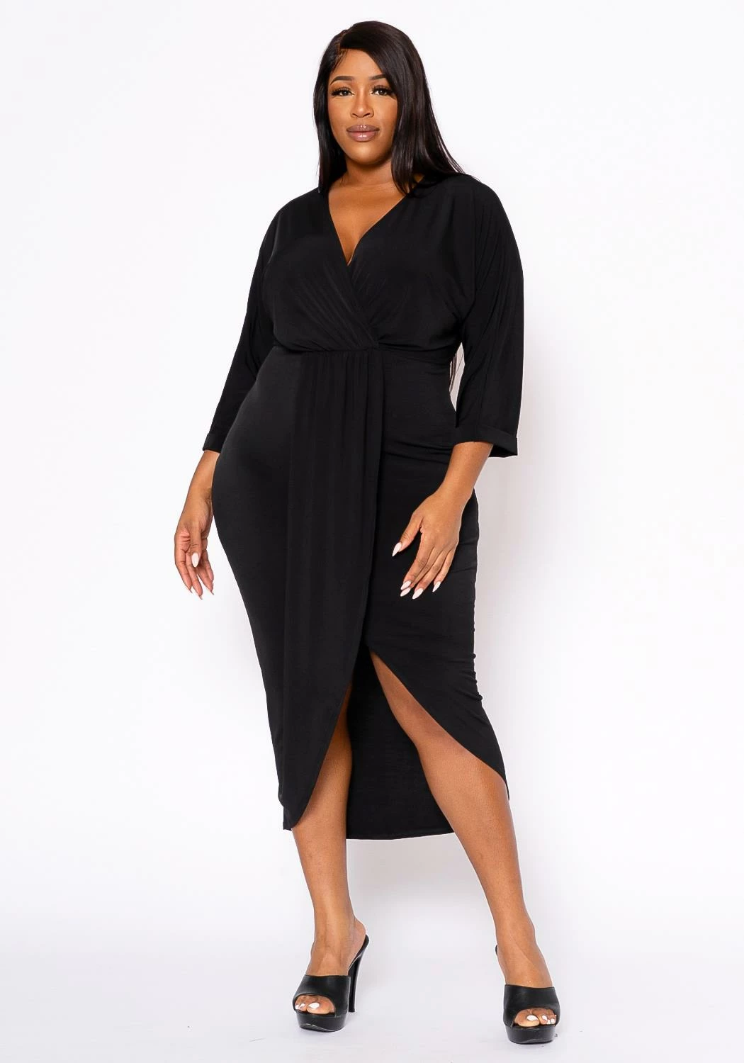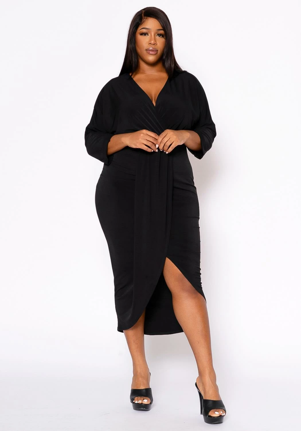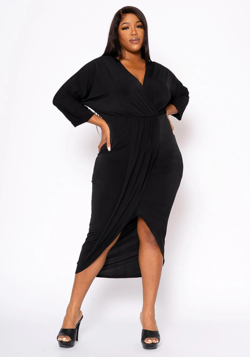 Gorgeous plus size women’s cocktail dress with drape front design, v-neck style, 3/4 long sleeves and midi length.