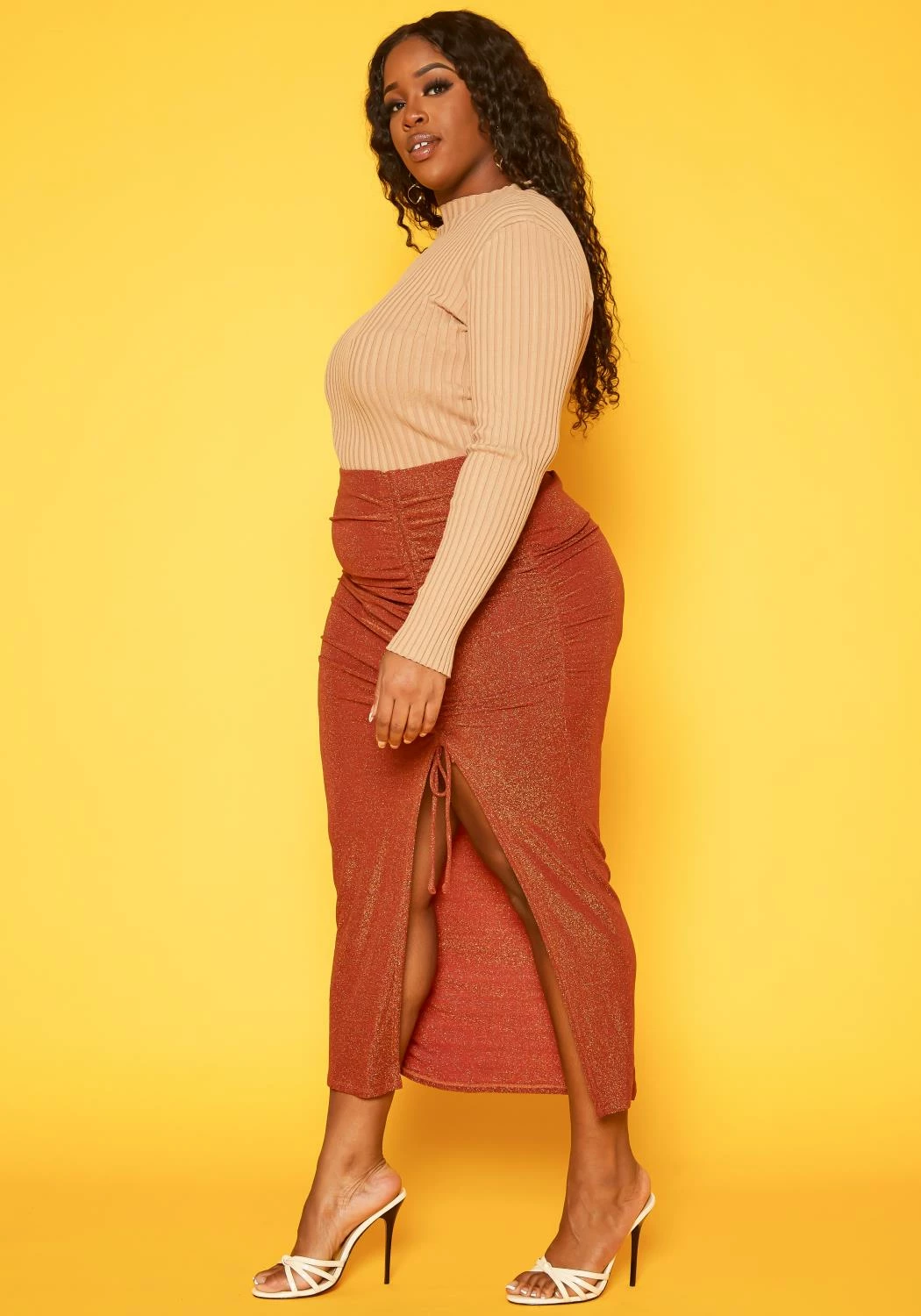 Stunning plus size women’s shimmer maxi skirt in trendy drawstring hem design, centered slit hem, high waist style and ruched details.