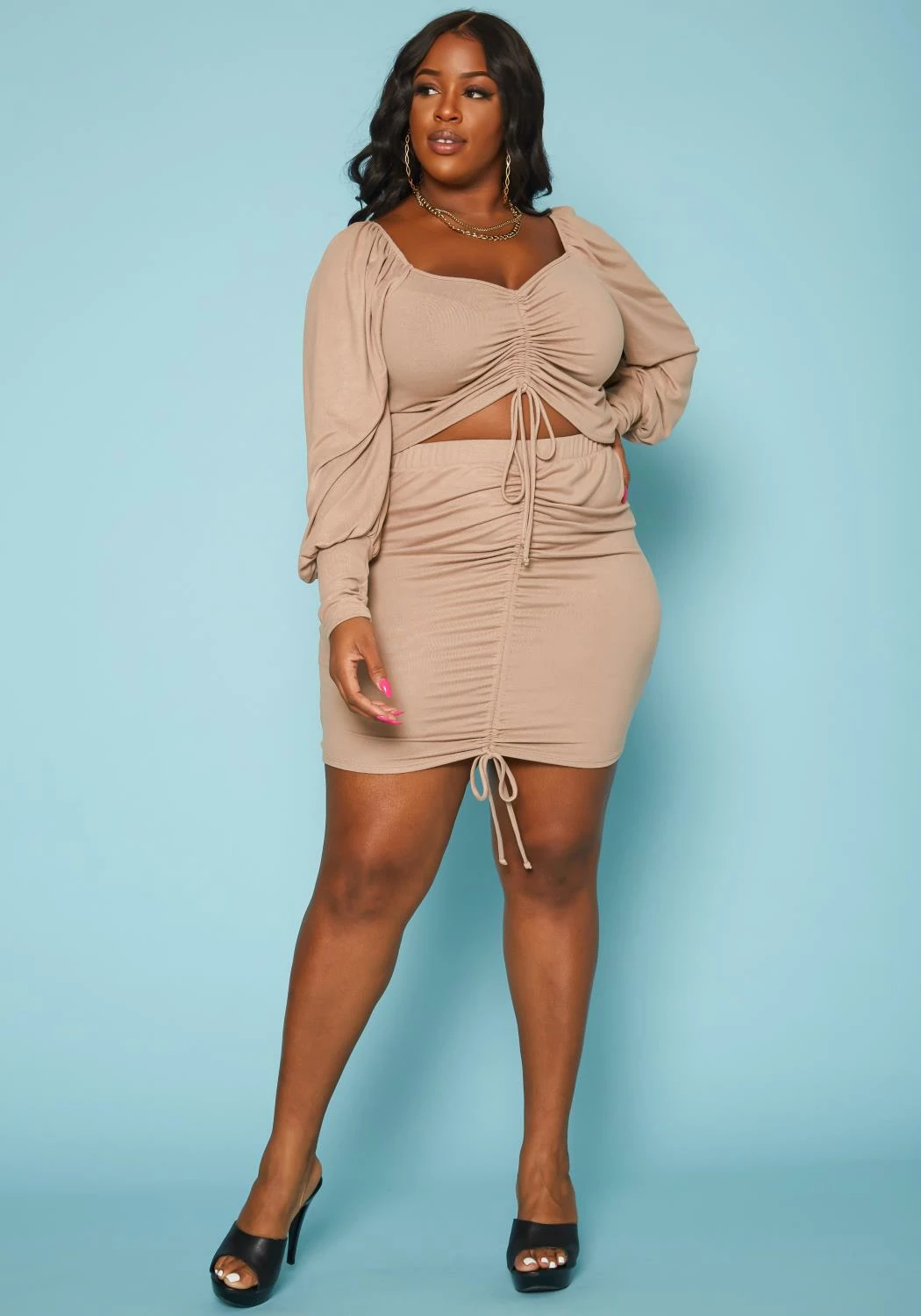 Favorite plus size women’s matching set with centered drawstring hem, v-neck style, long sleeve crop top and high waist bodycon mini skirt.
