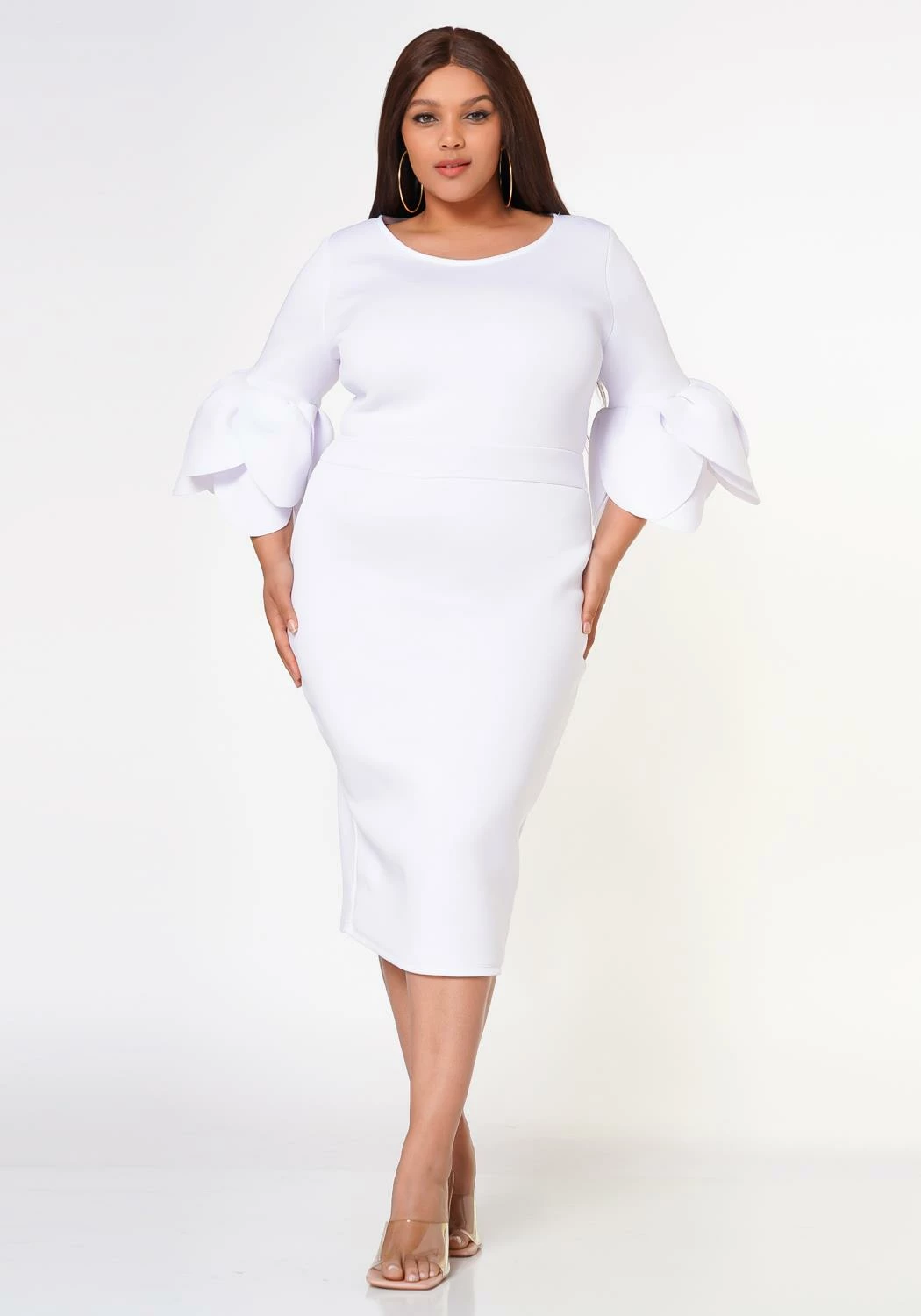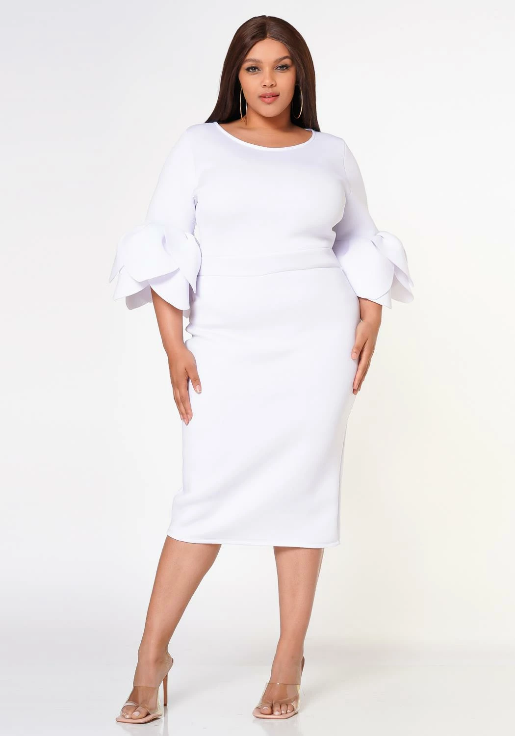 Plus size elegant midi dress made with quality scuba material, petal edged flare sleeves and fitted design. Contains a back zipper closure.