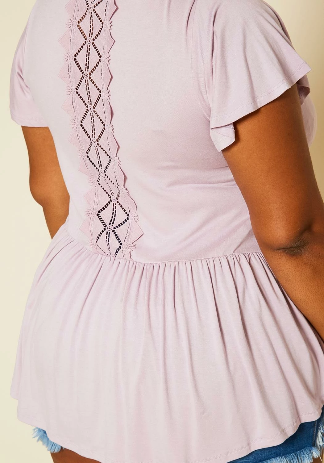 Plus size women’s top in peplum style, featuring a round neck hem, flounce short sleeves & back embroidered detail.